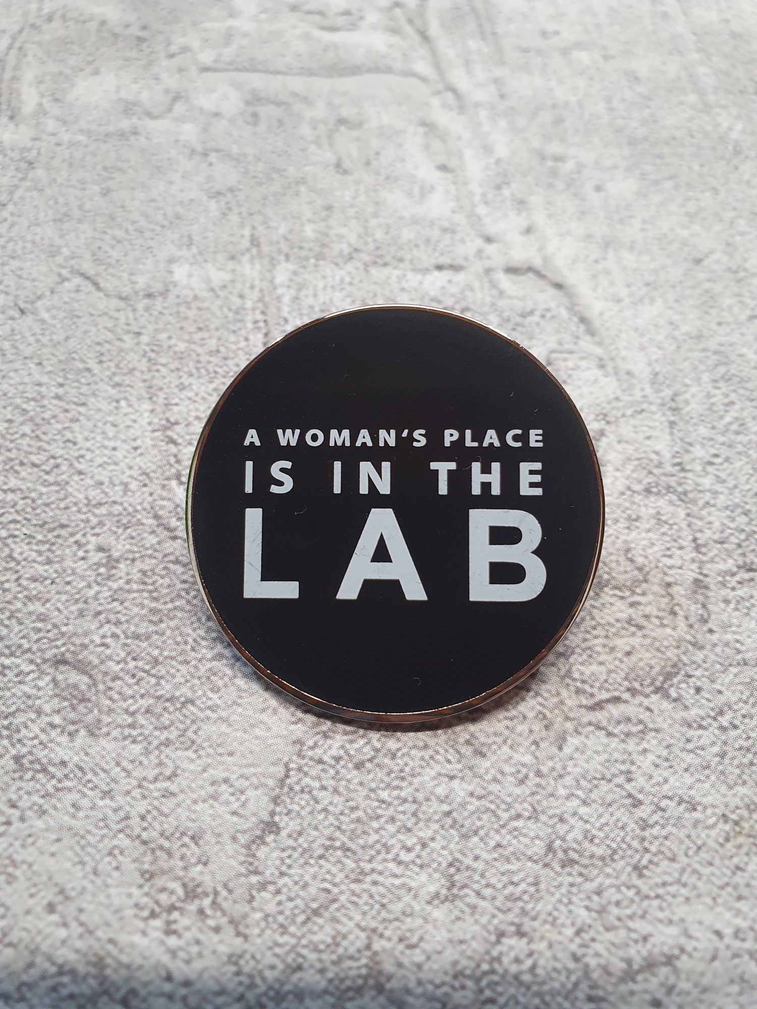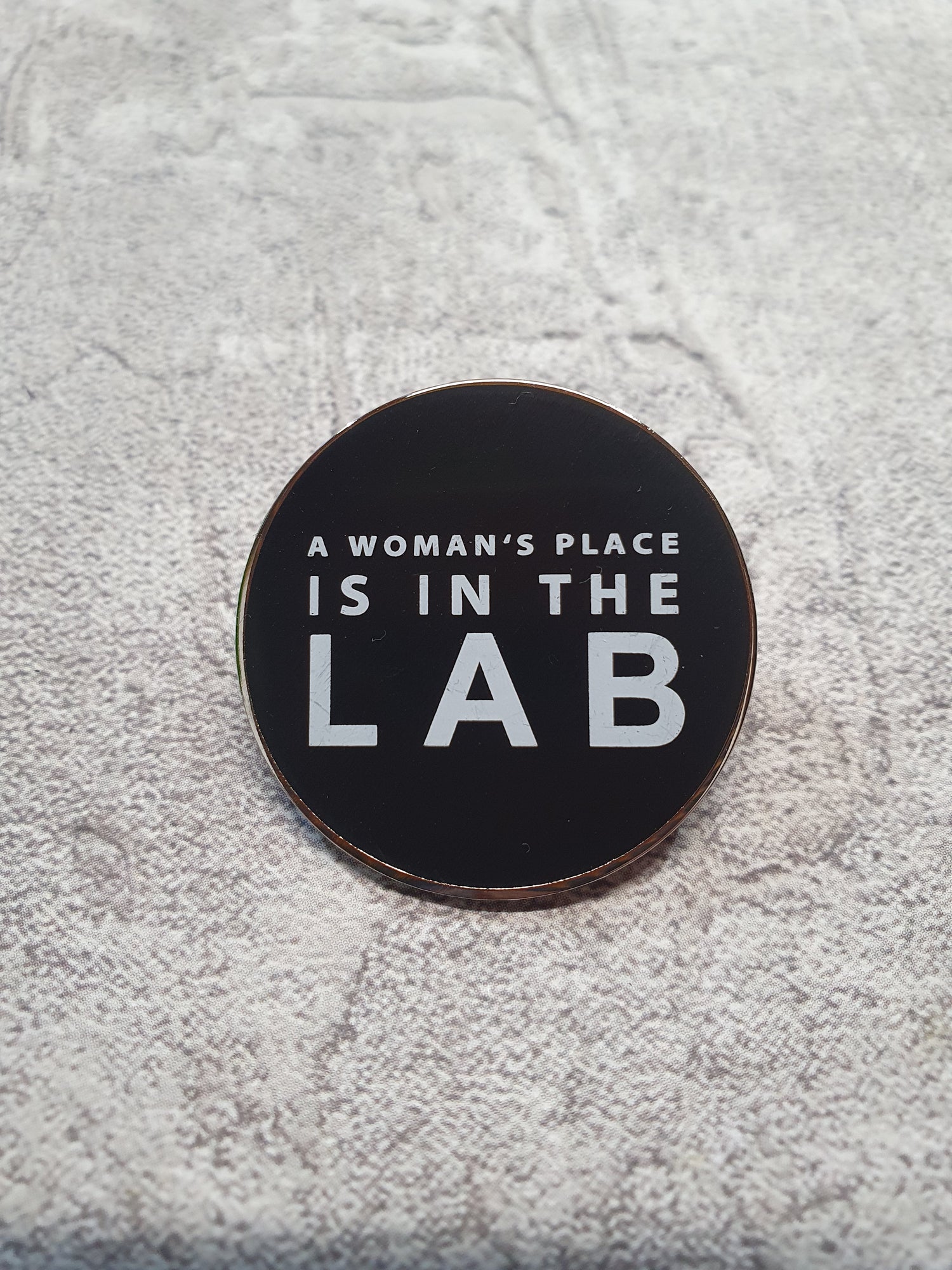 A woman's place is in the lab. Enamel pin with rubber stopper.