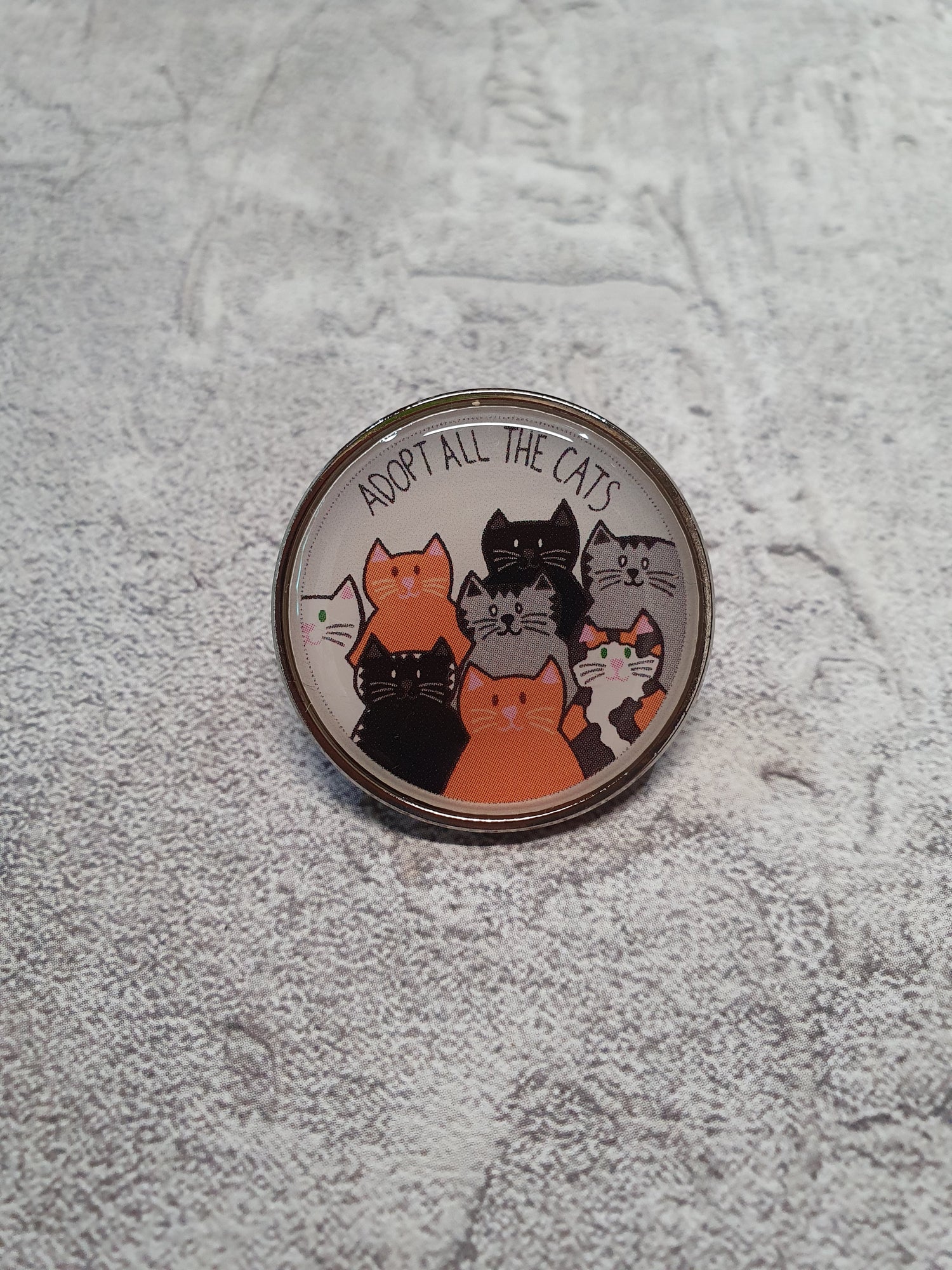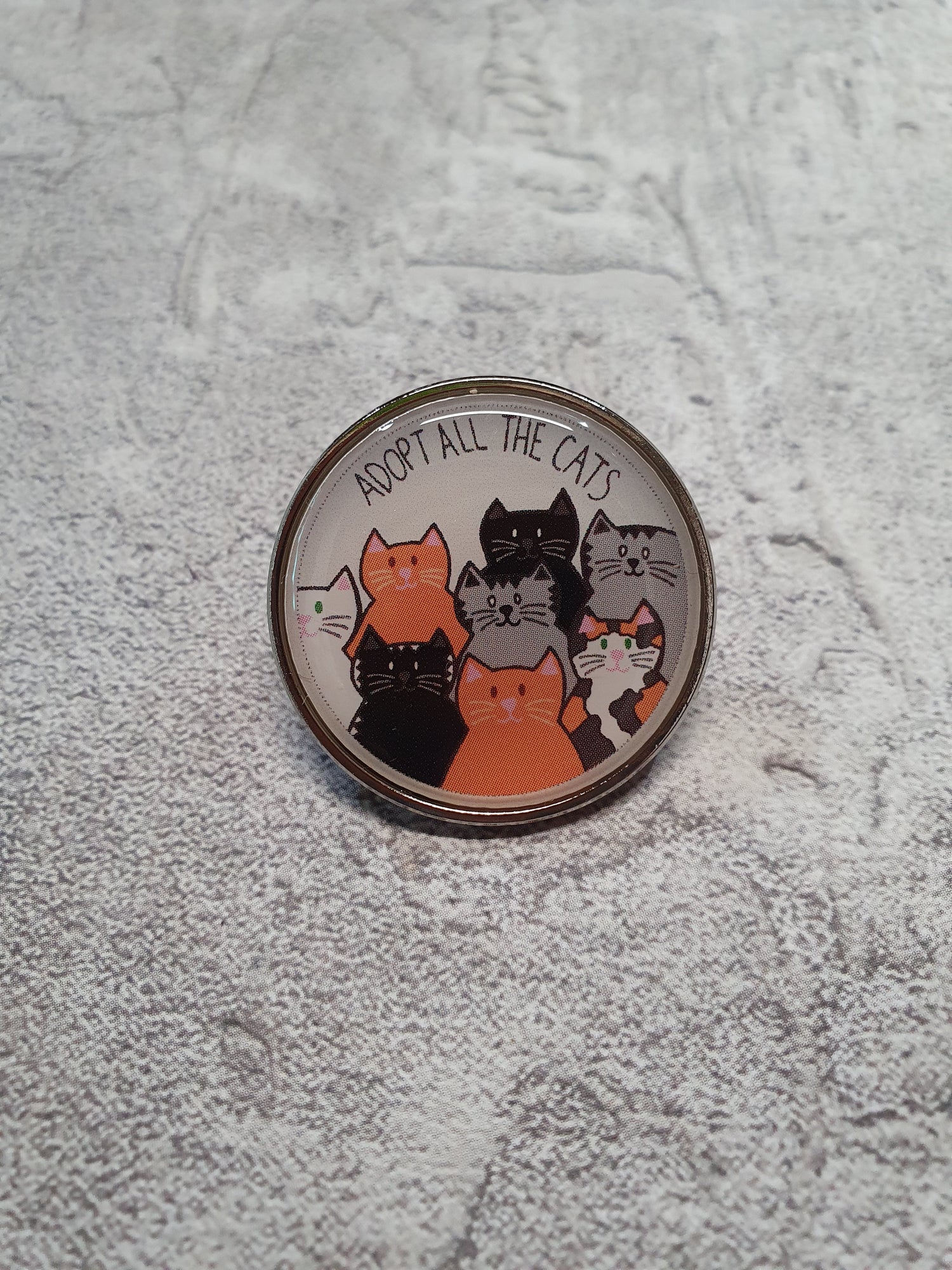 Enamel and resin "Adopt all the cats" pin with rubber stopper.