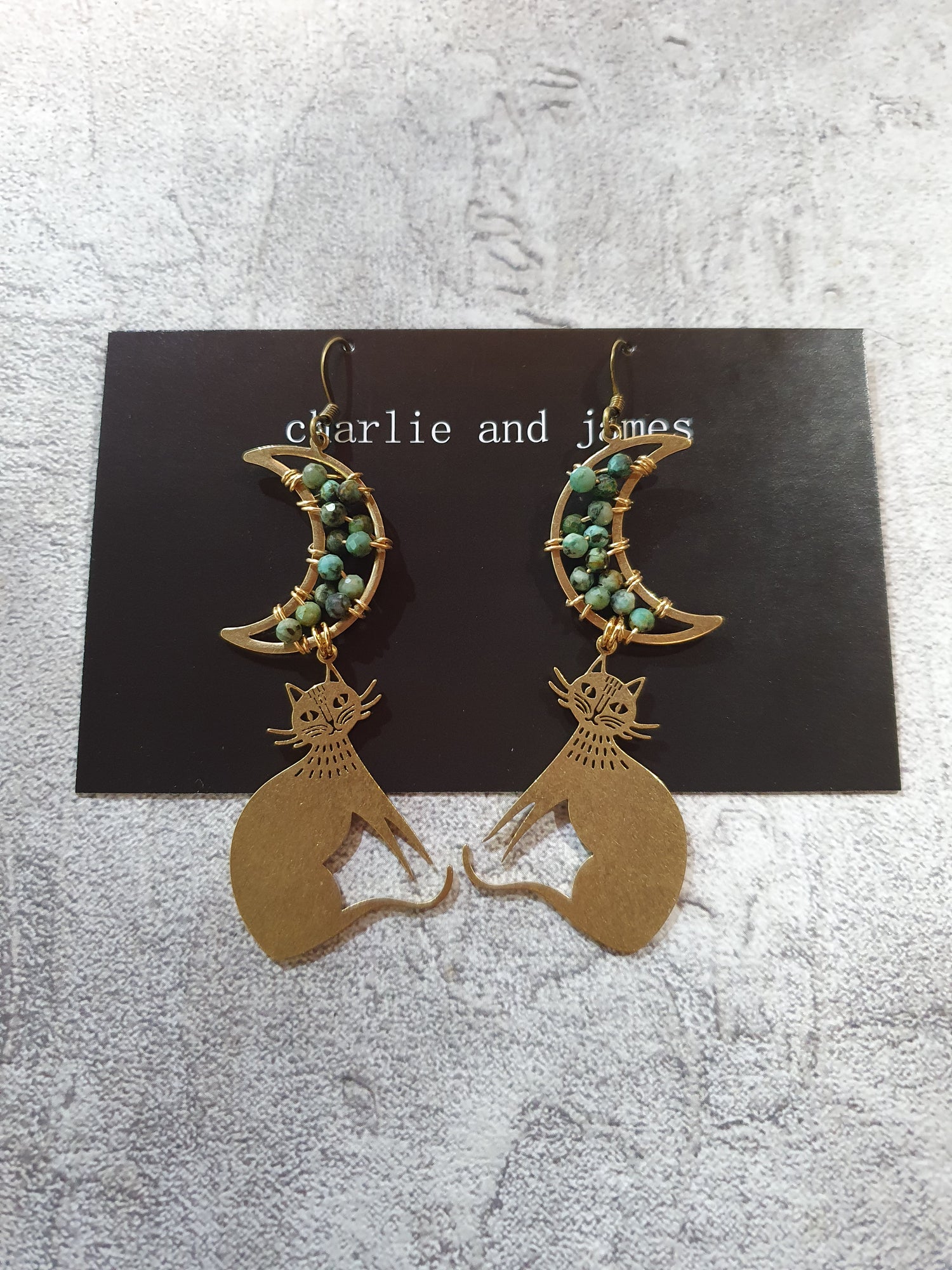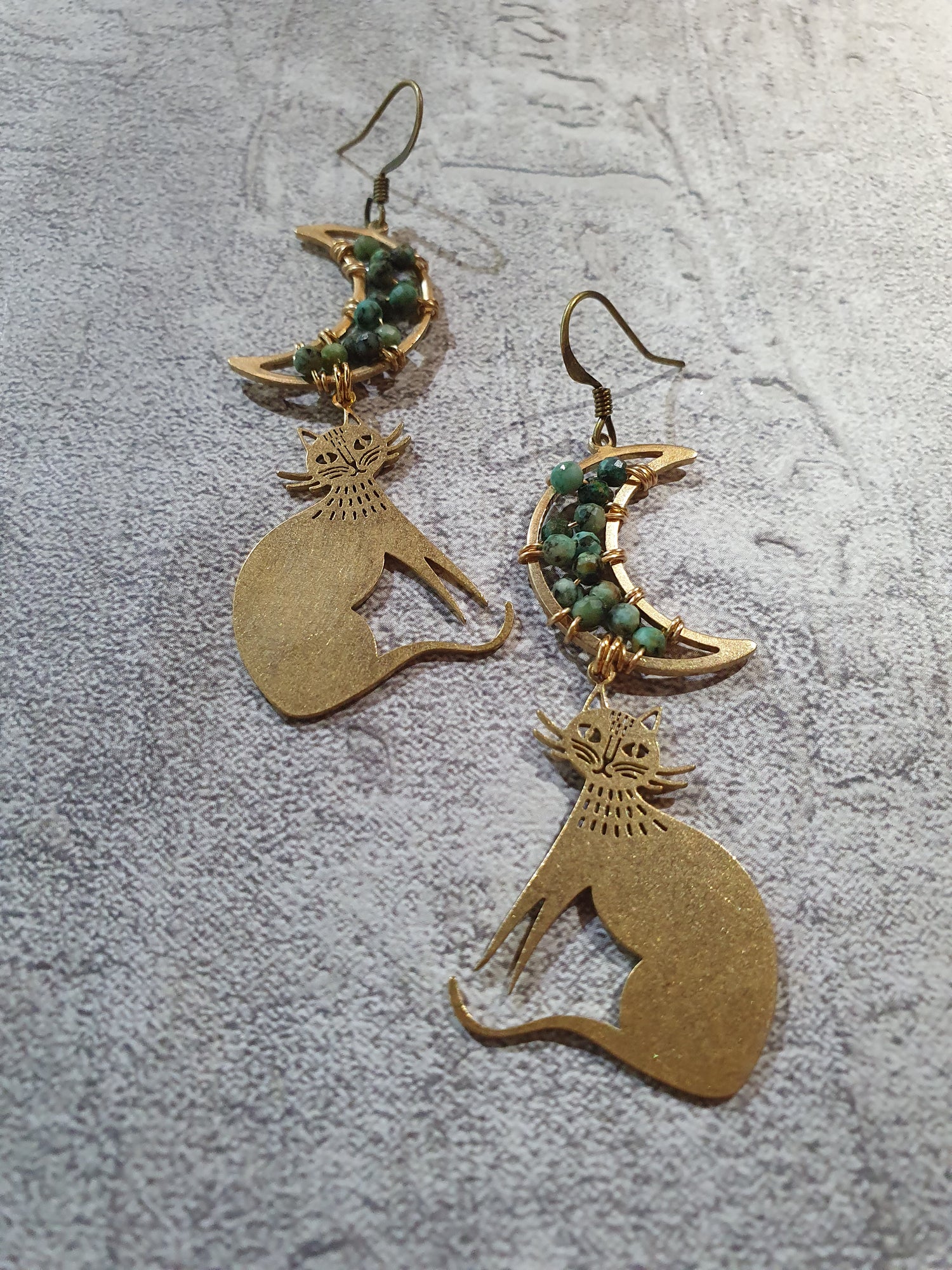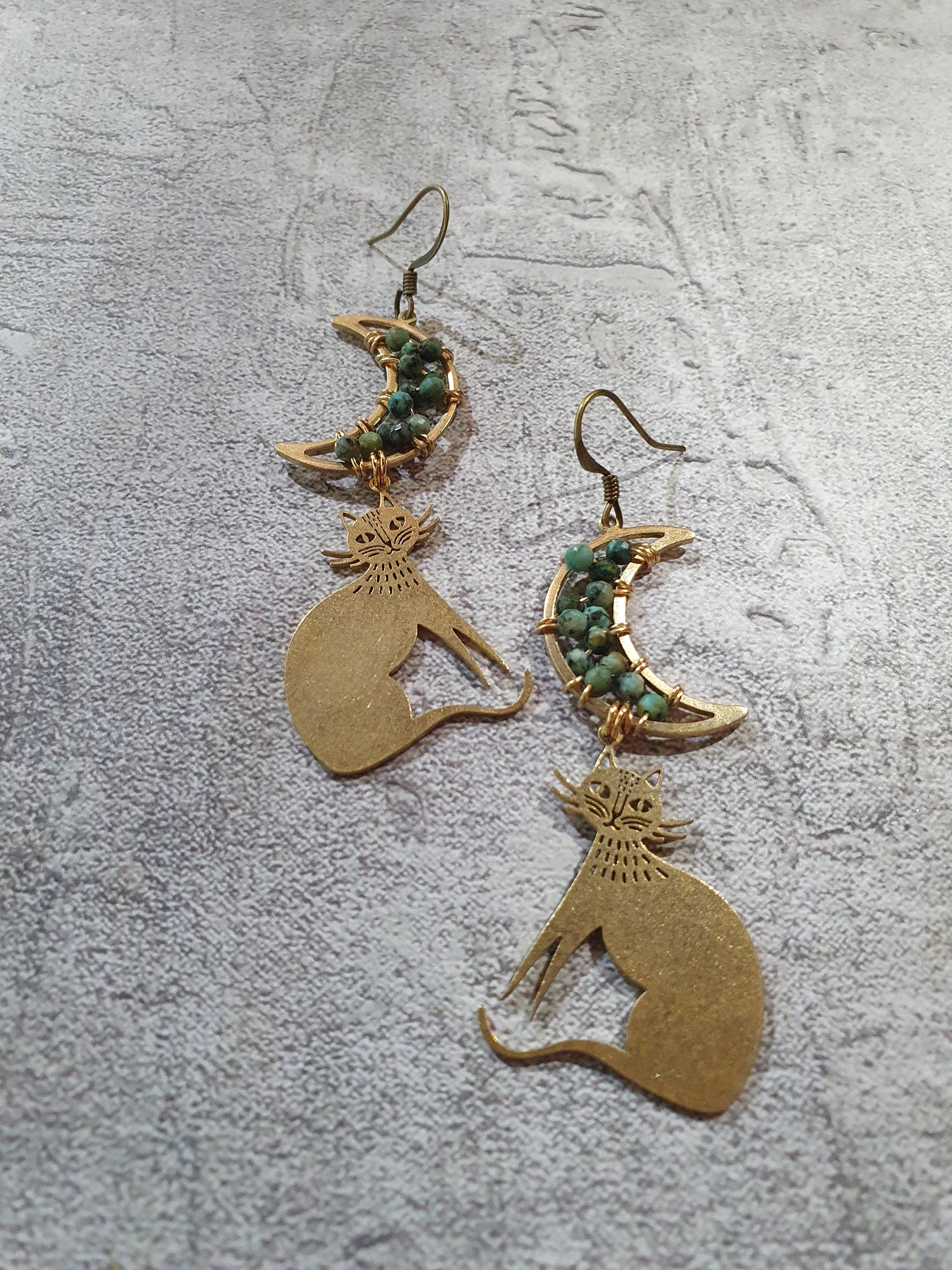 African turquoise wrapped moons with brass cats. Low allergenic brass earwires. No nickel, lead or cadmium.