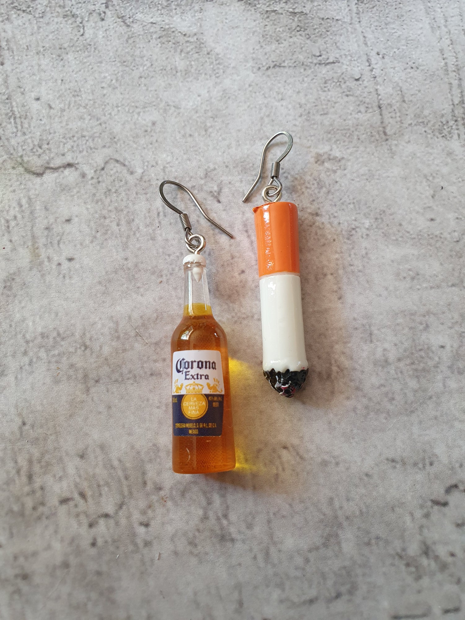 Lightweight resin mismatched Corona bottle and cigarette. Surgical steel earwires.
