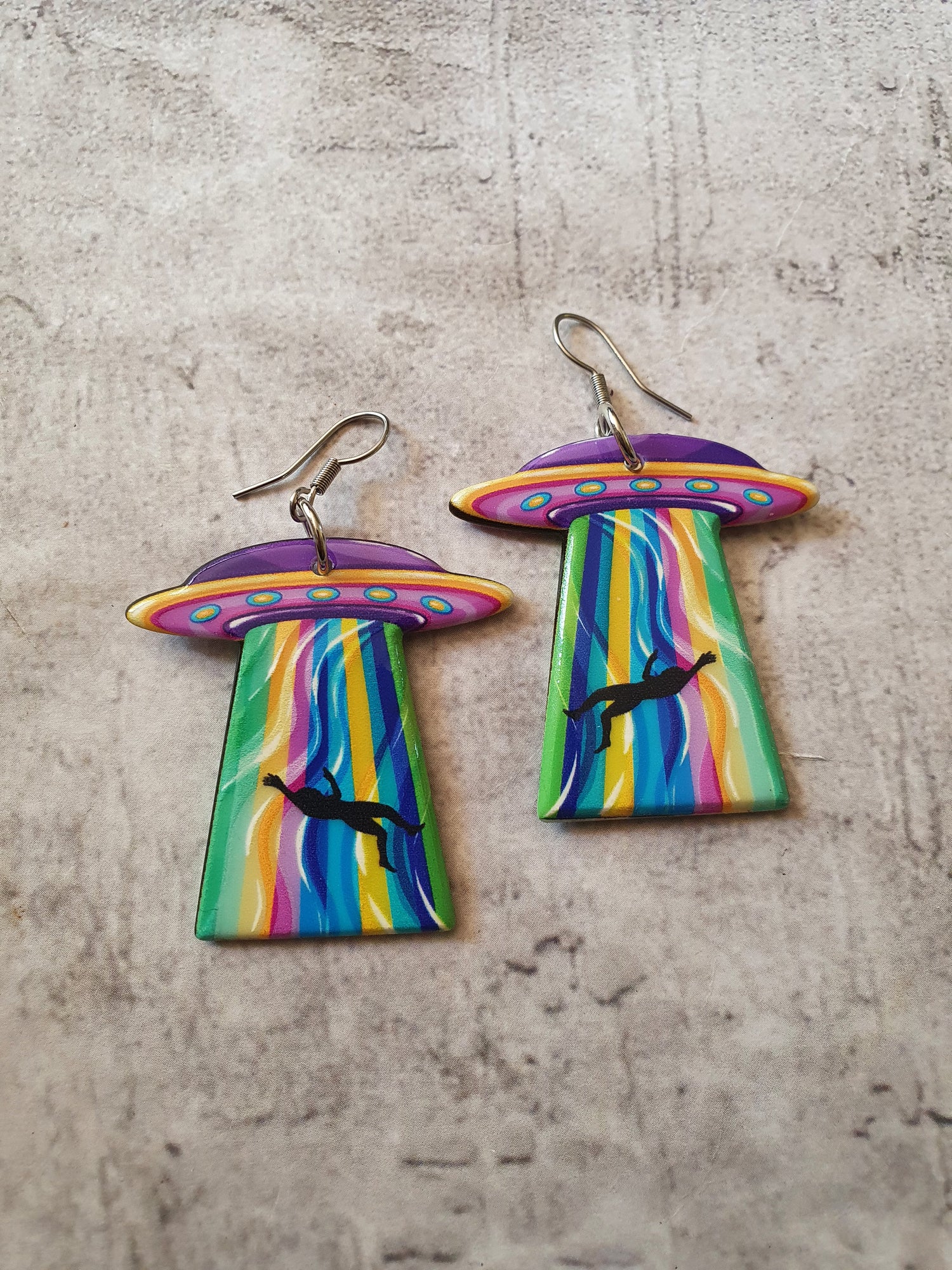 Fun resin U.F.O's with a hitch-hiker caught in the tractor beam. Surgical steel earwires.