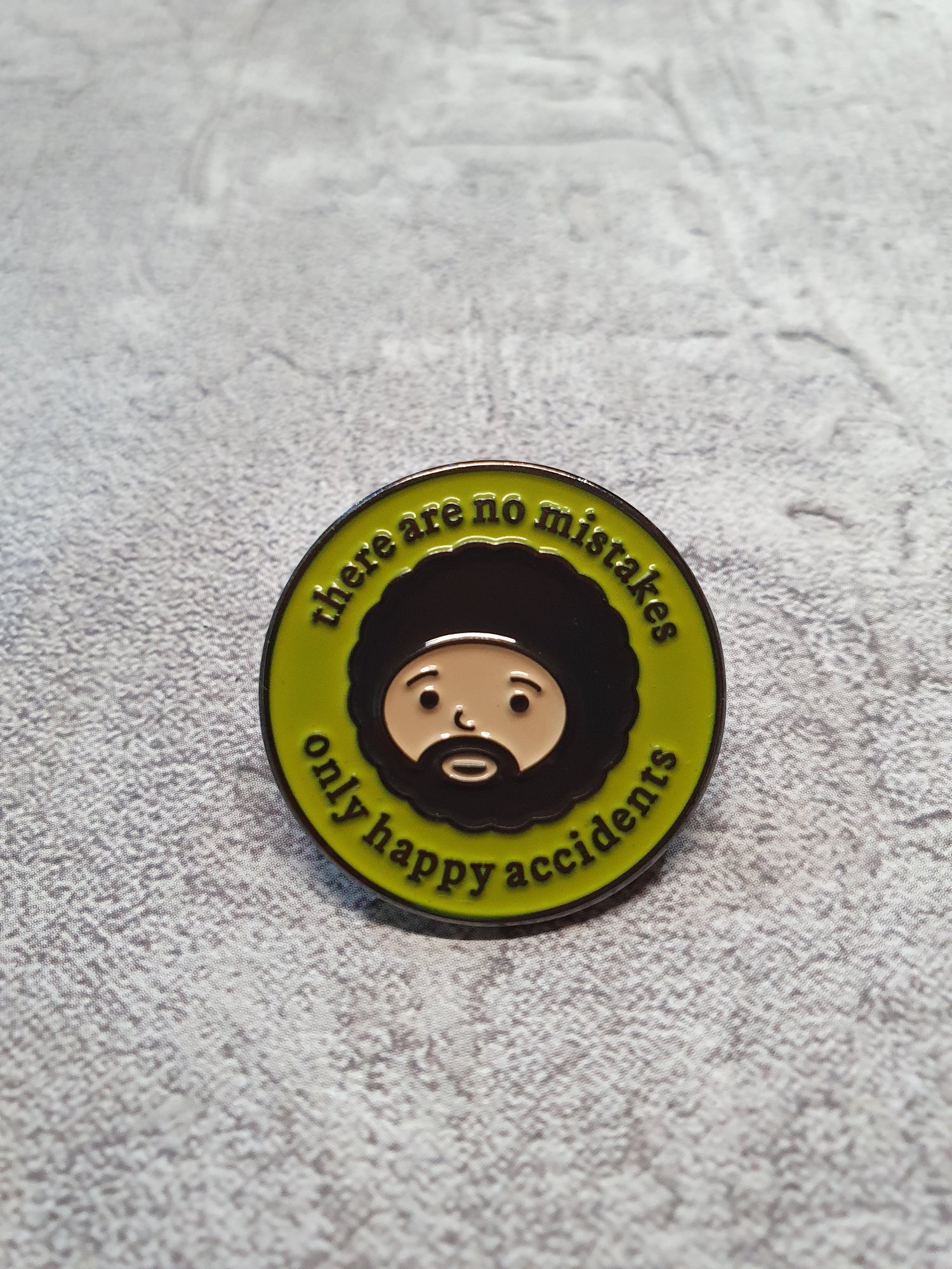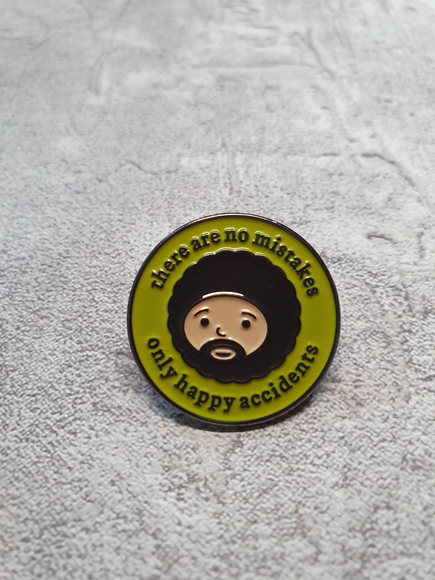 Bob Ross quote "There are no mistakes only happy accidents". Enamel pin with stopper.