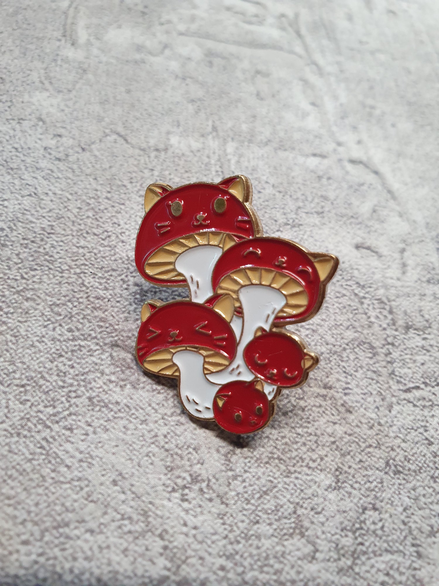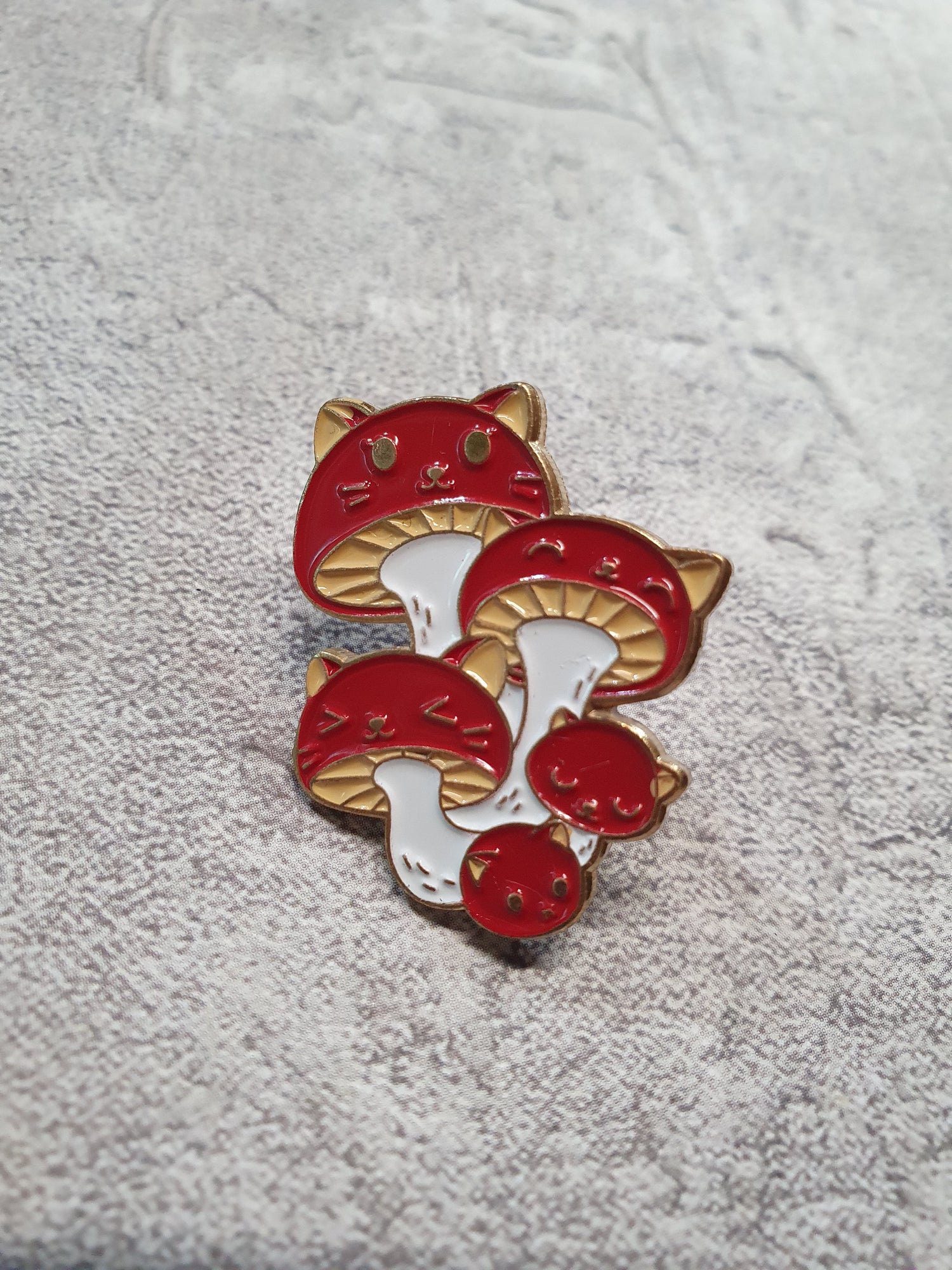 Adorable cat mushroom cluster. Enamel pin with rubber stopper.