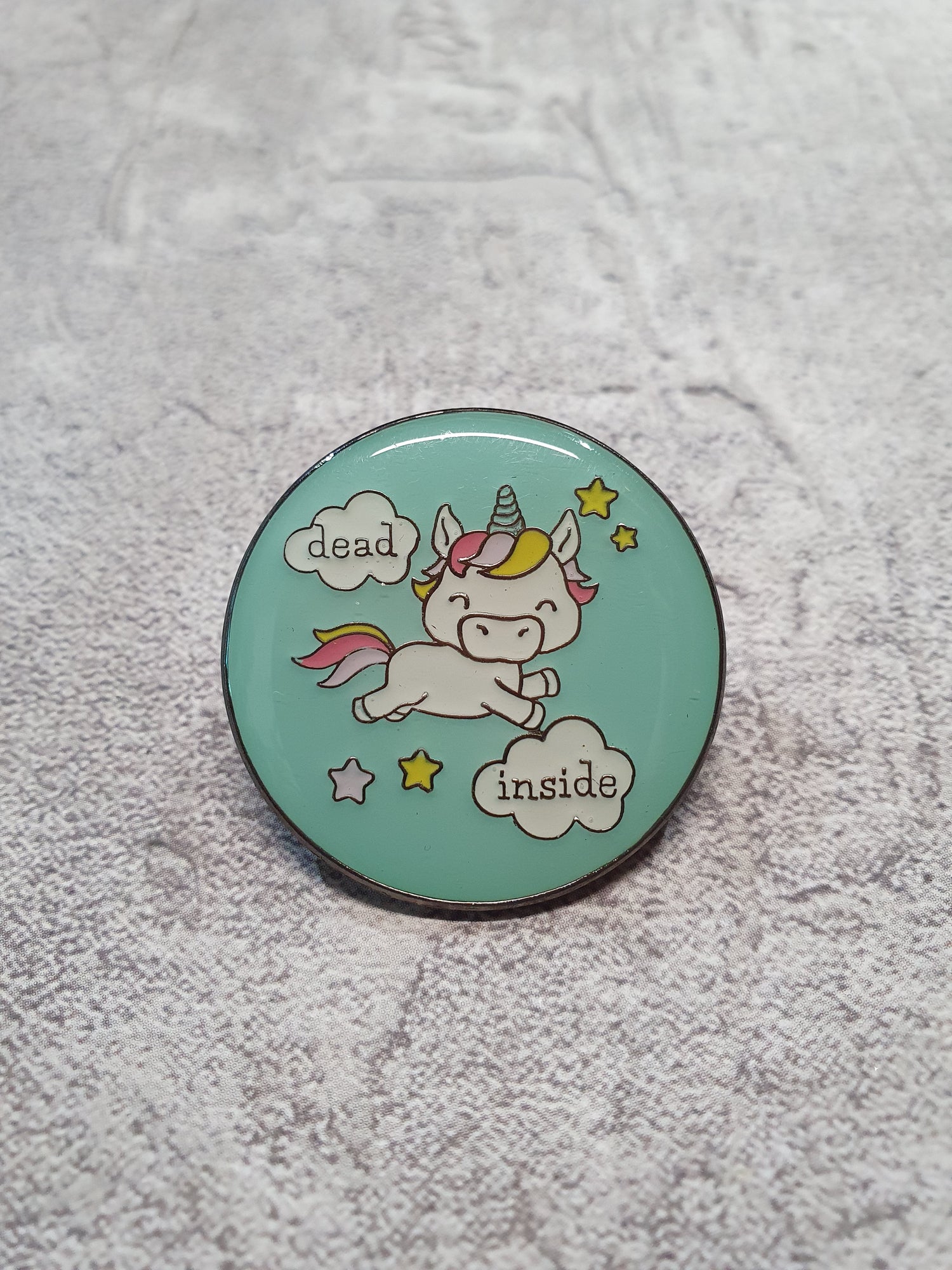 Cute unicorn dead inside enamel pin with rubber stopper.