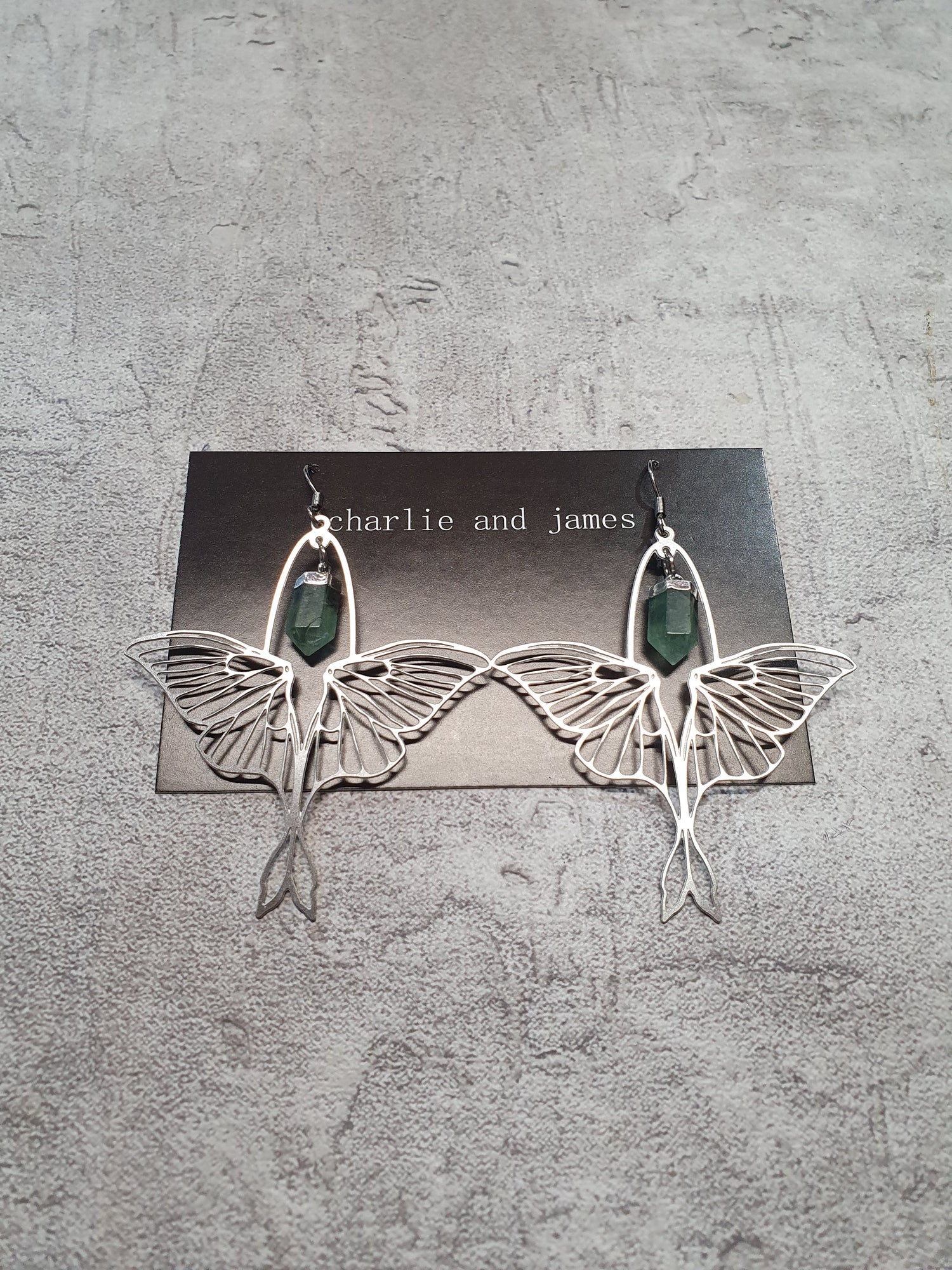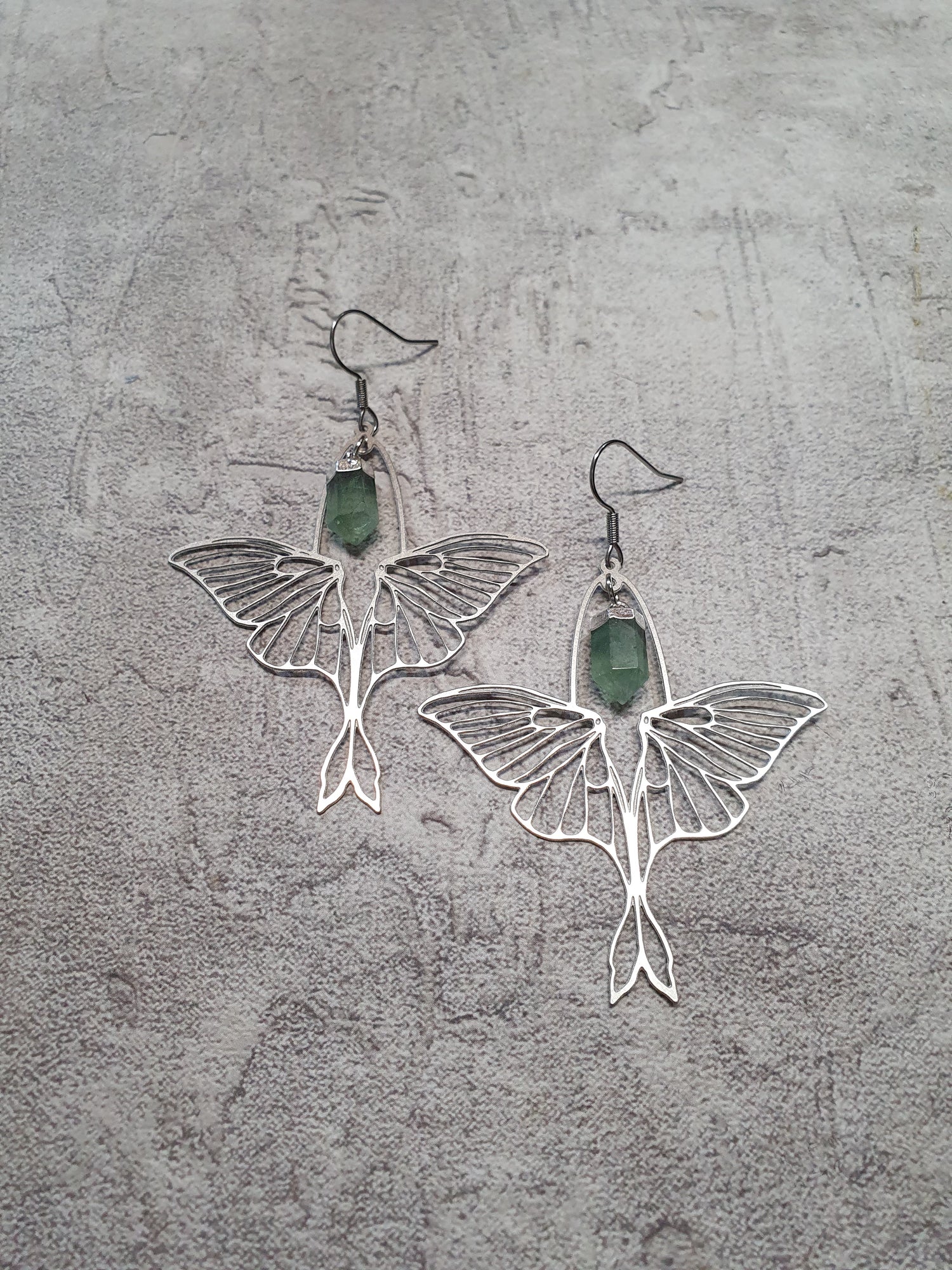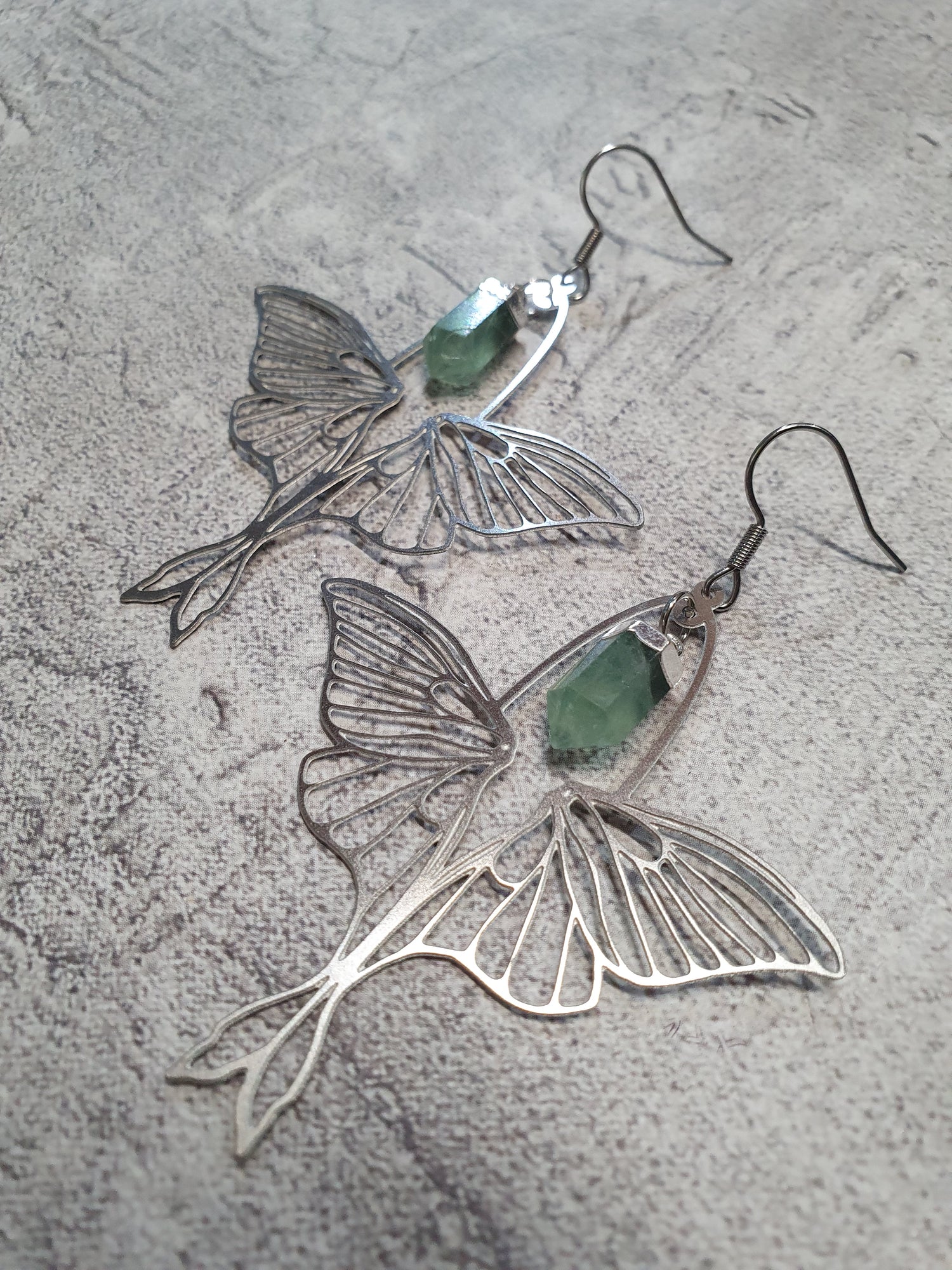Stainless steel butterflies with flourite points. Surgical steel earwires.