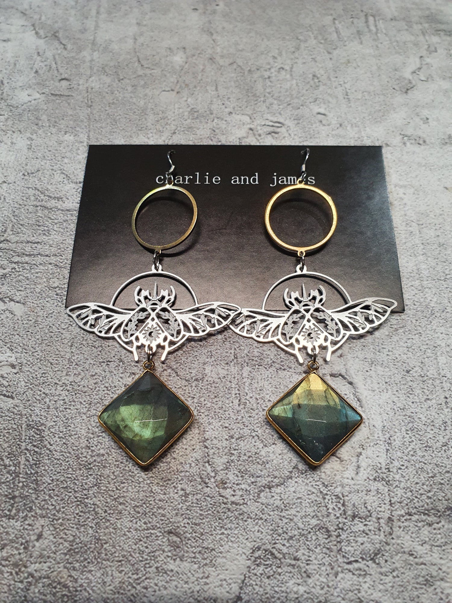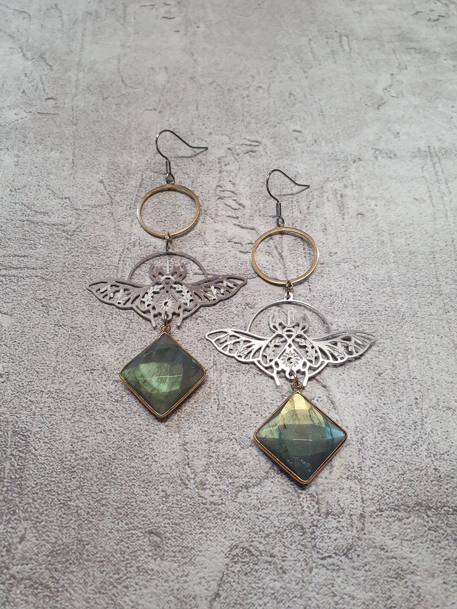 Stainless steel flying scarabs with brass hoops and gold plated labradorite. Surgical steel earwires.