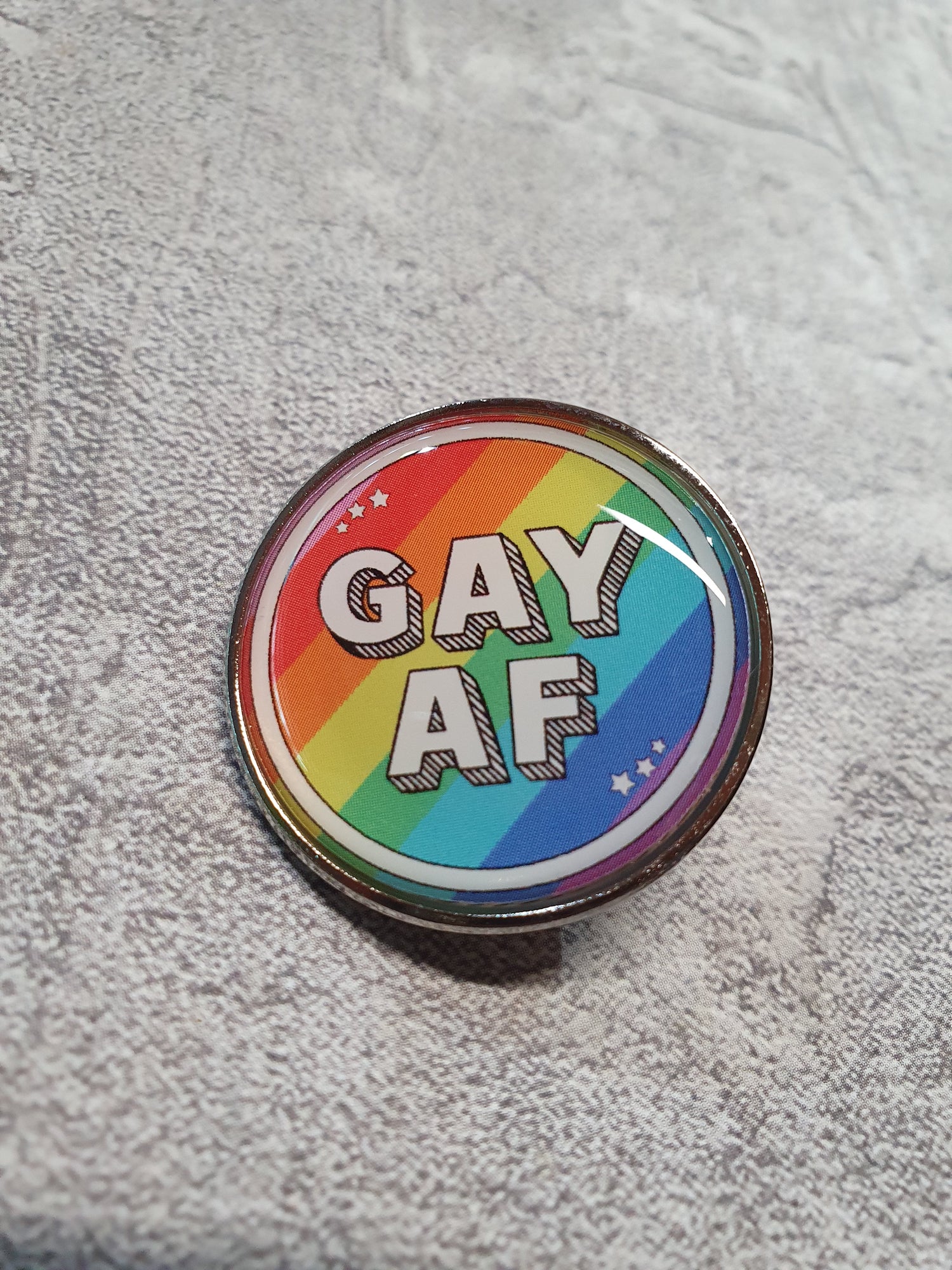 Enamel nd resin "Gay AF" pin with rubber stopper.