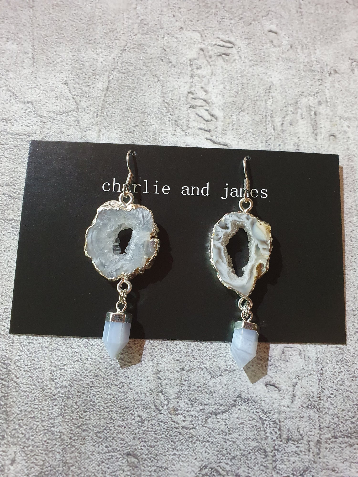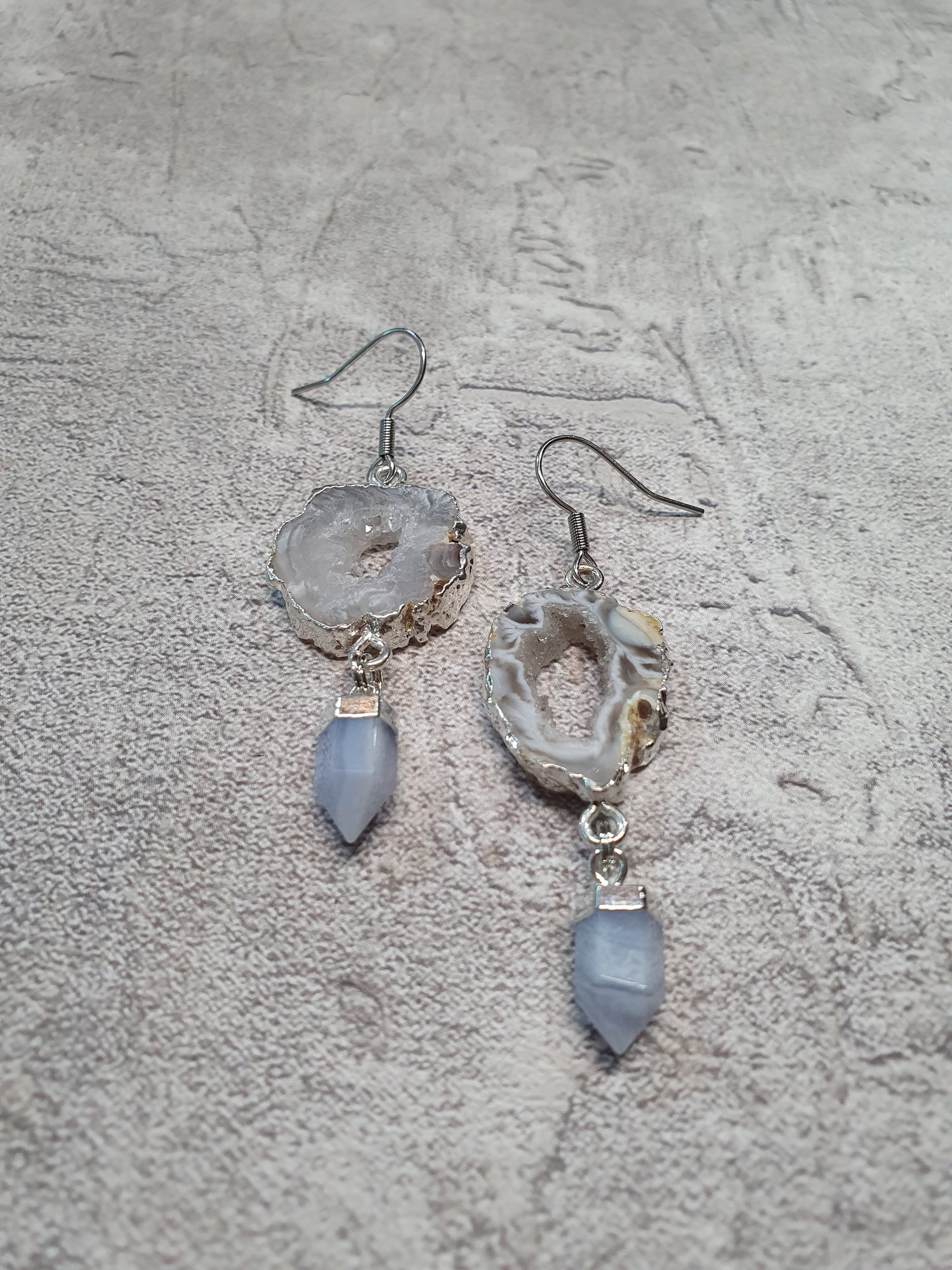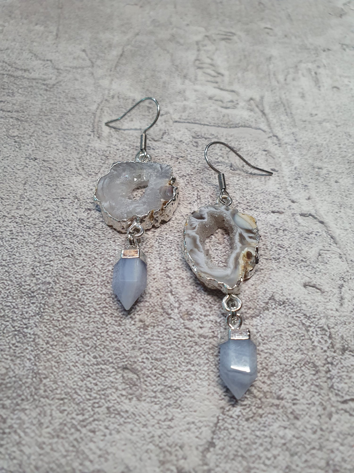 Silver electroplated agate geode slice with blue lace agate. Surgical steel earwires.