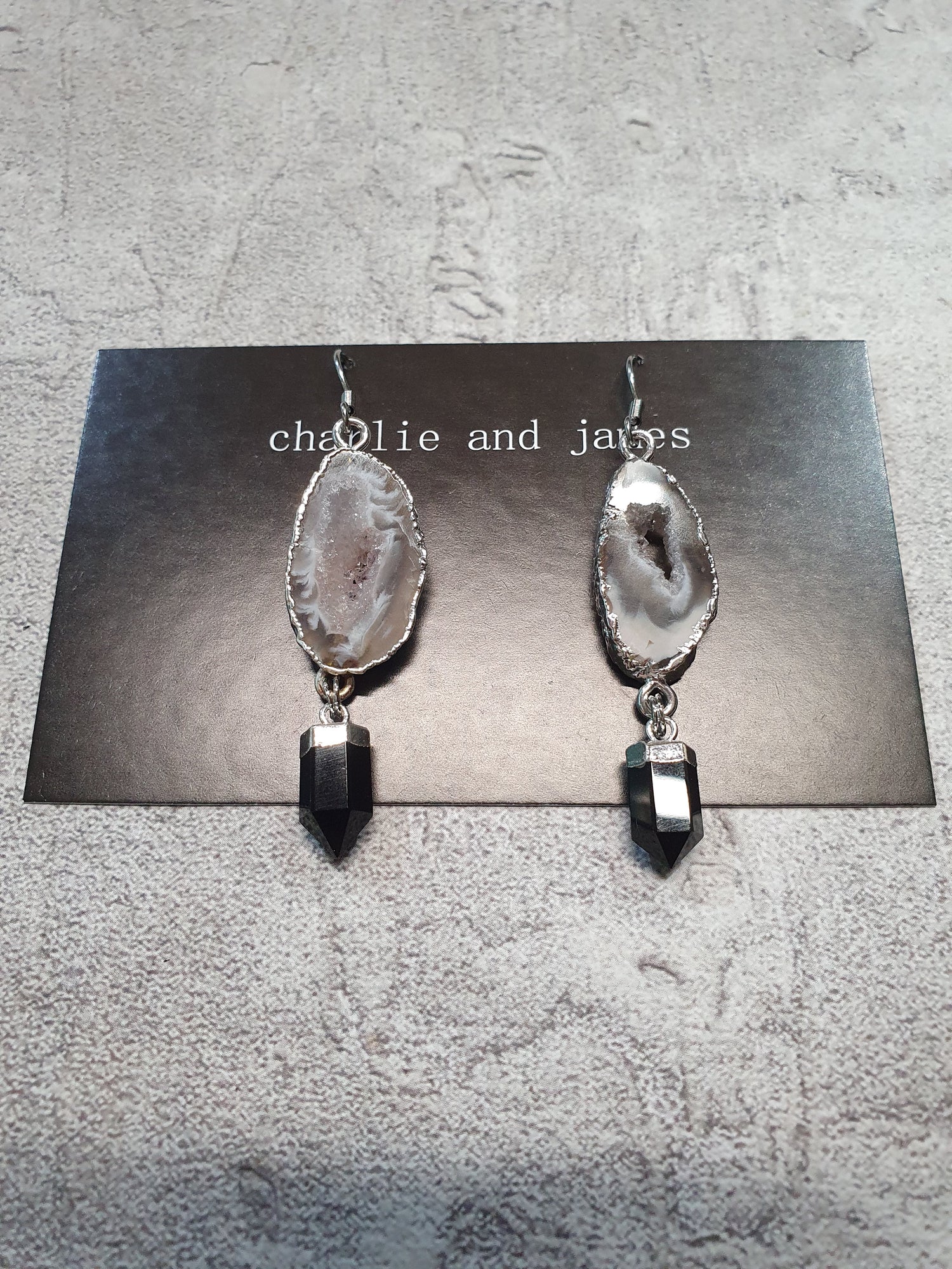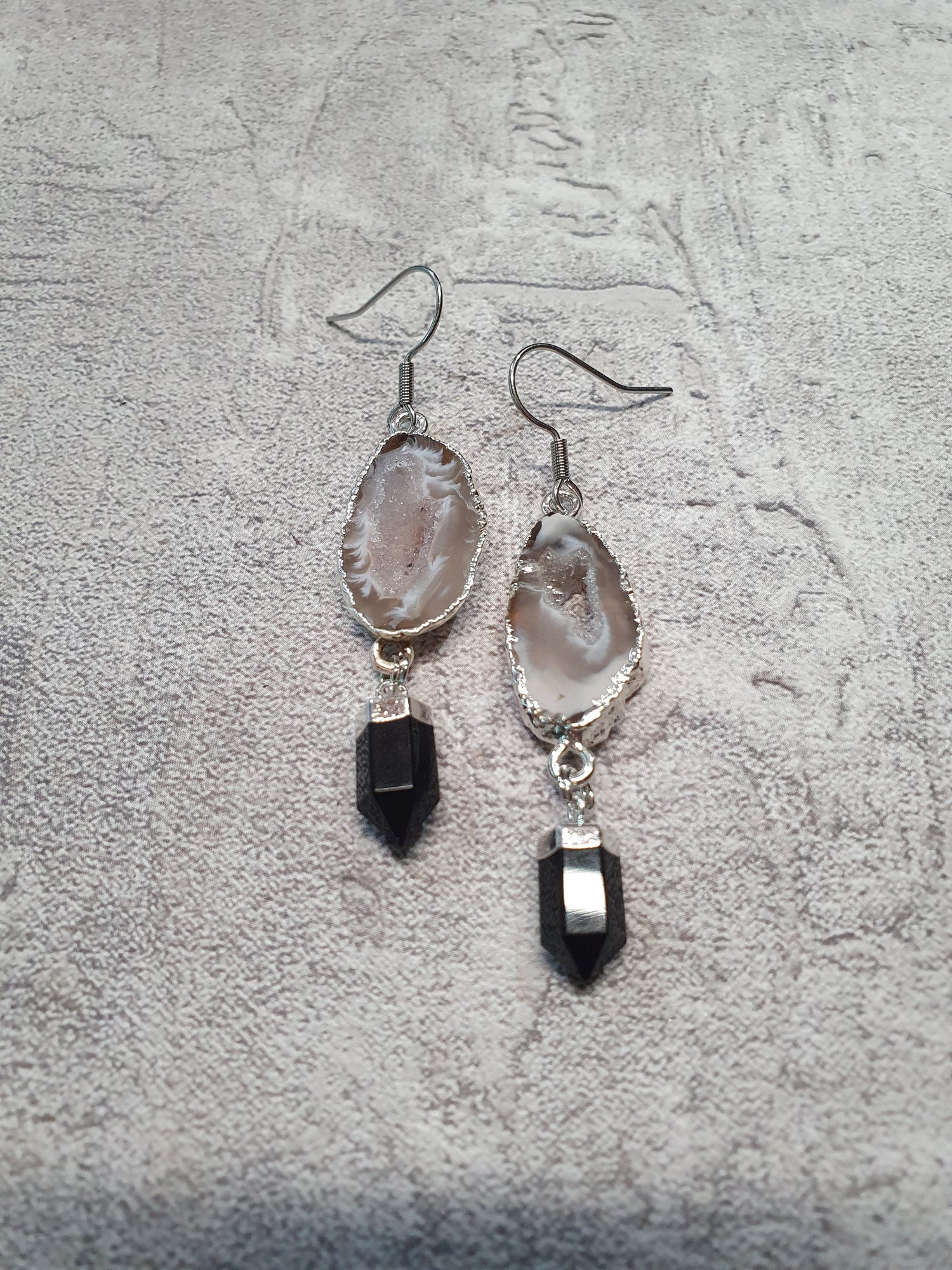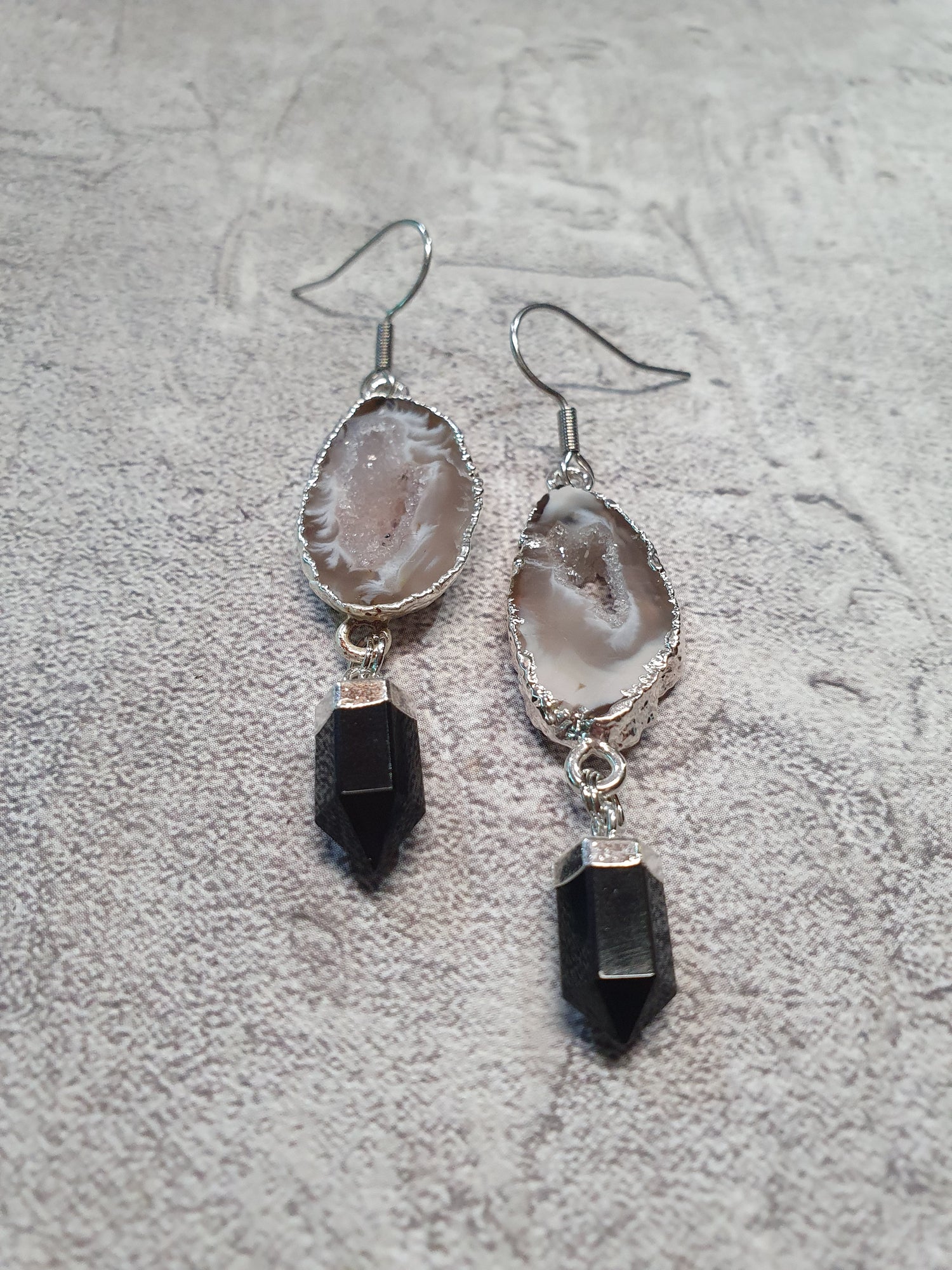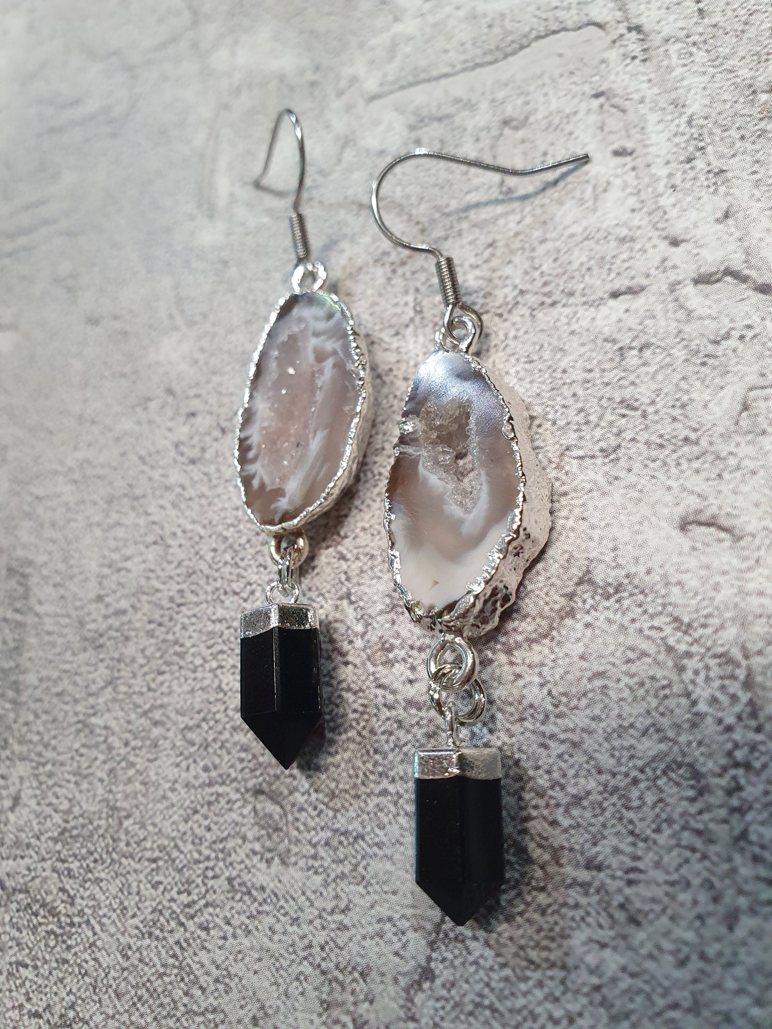 Silver electroplated agate geode slice with onyx drops. Surgical steel earwires.