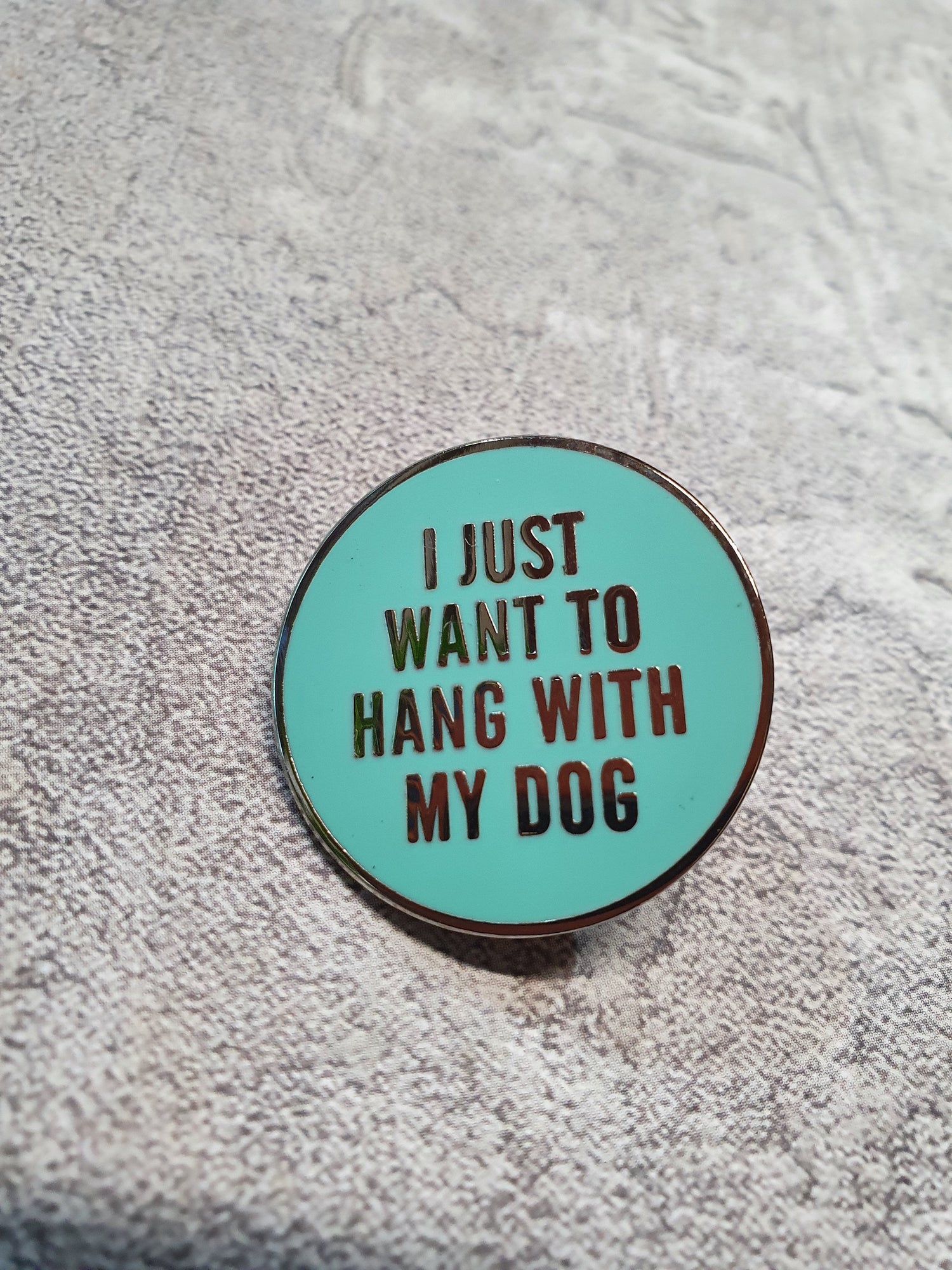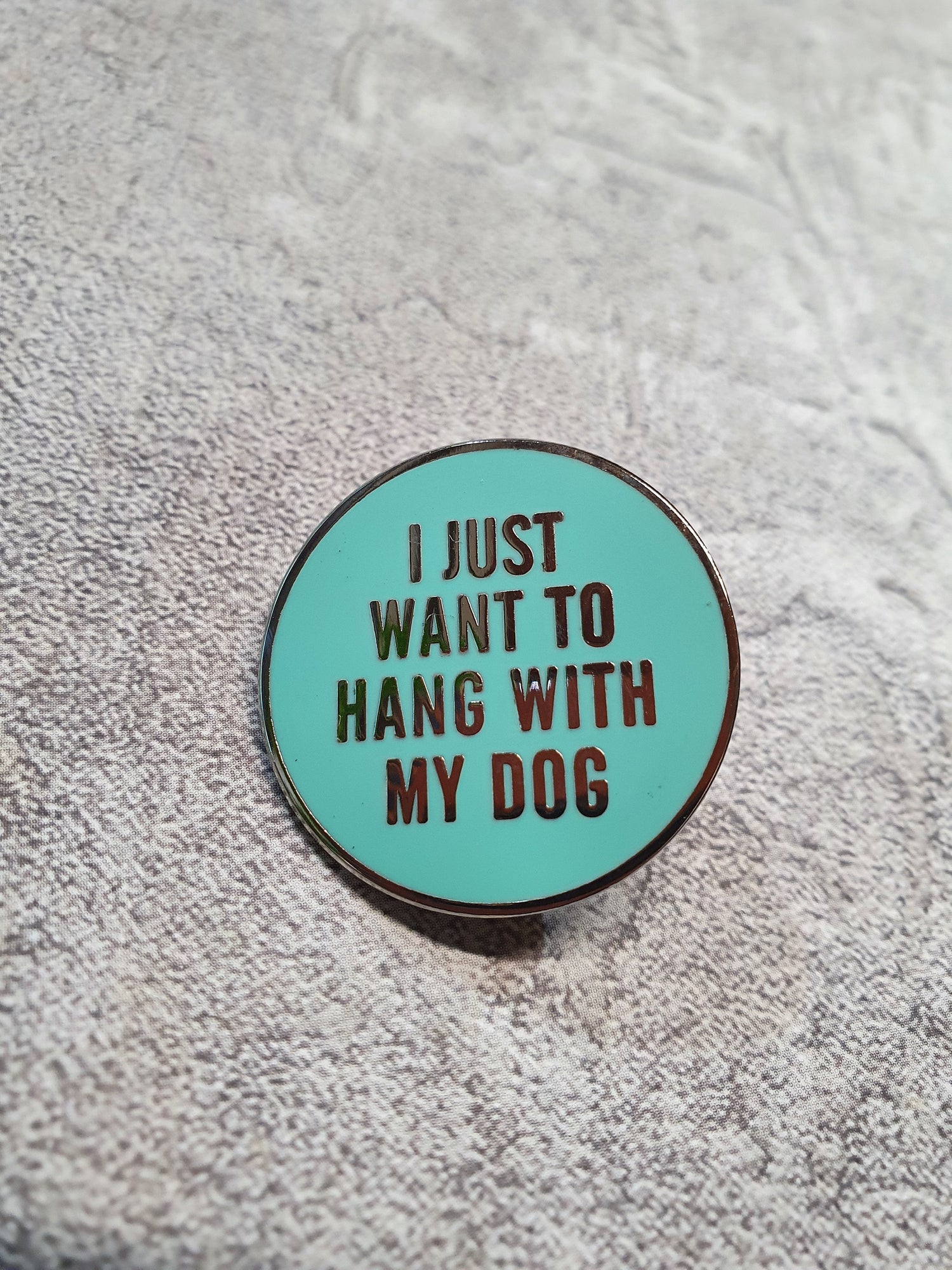 Enamel "I just wanna hang with my dog" pin with rubber stopper.