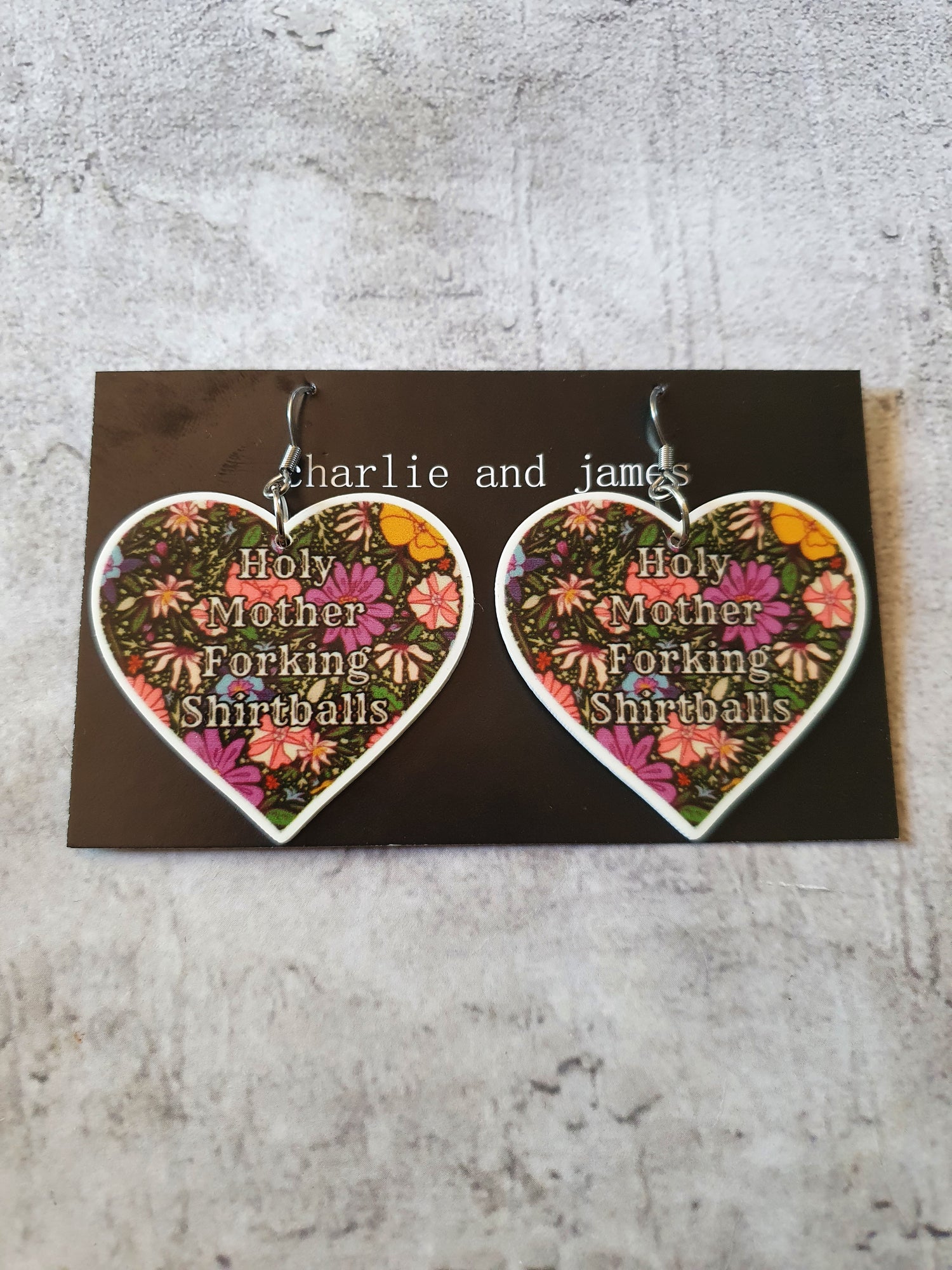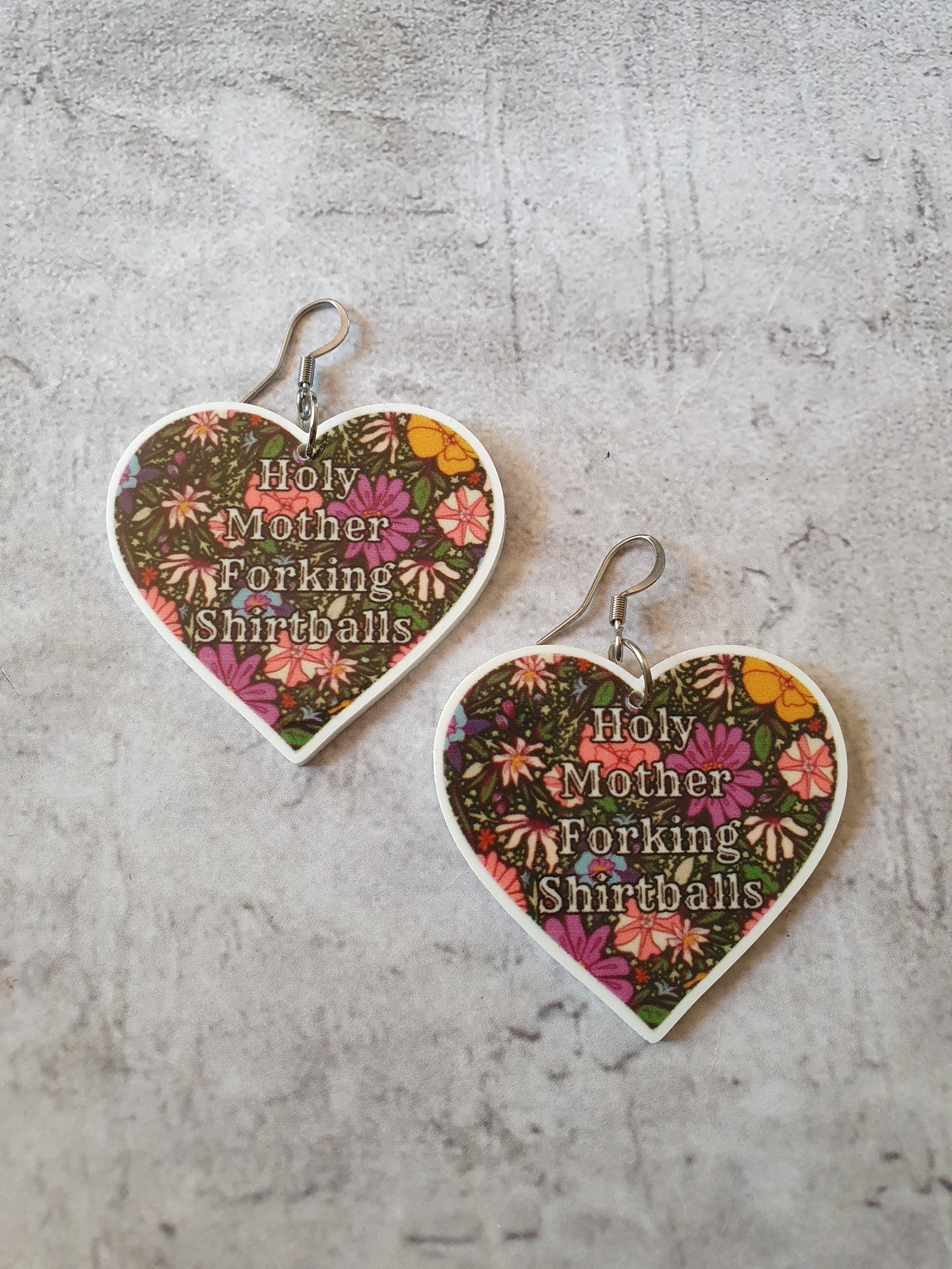 Lightweight resin hearts rinted with Holy Mother Forking Shirtballs. Surgical steel earwires.
