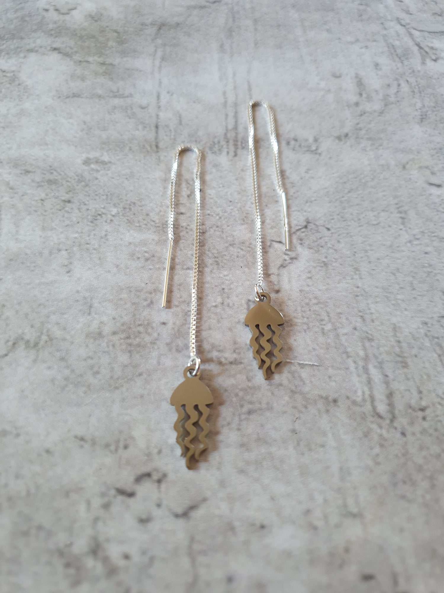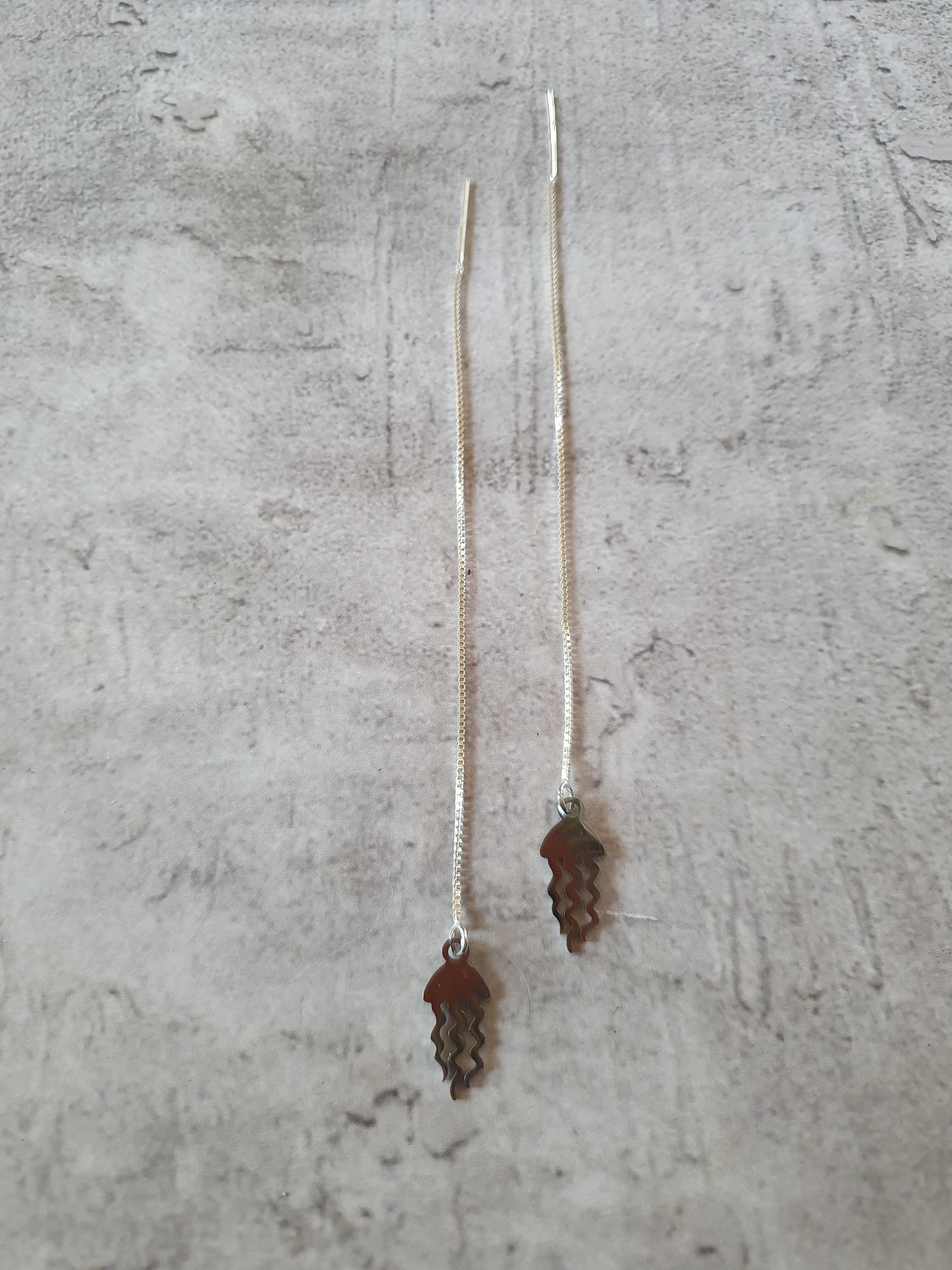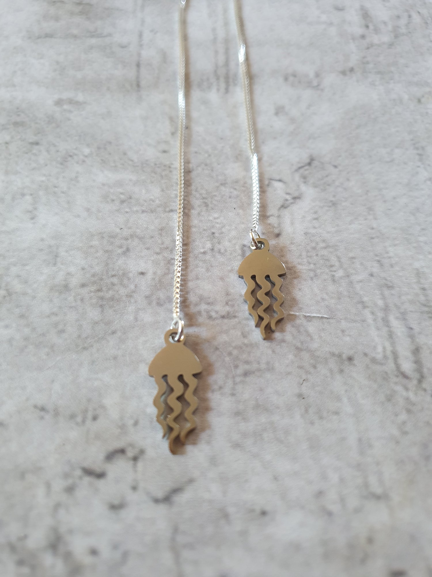 Sterling silver box chain ear threads with stainless steel jellyfish charms.