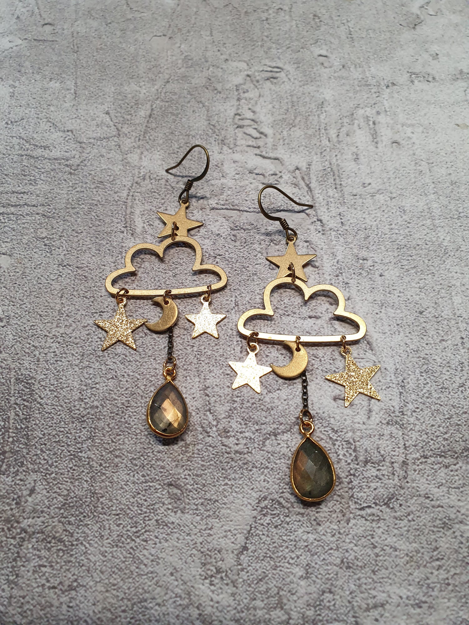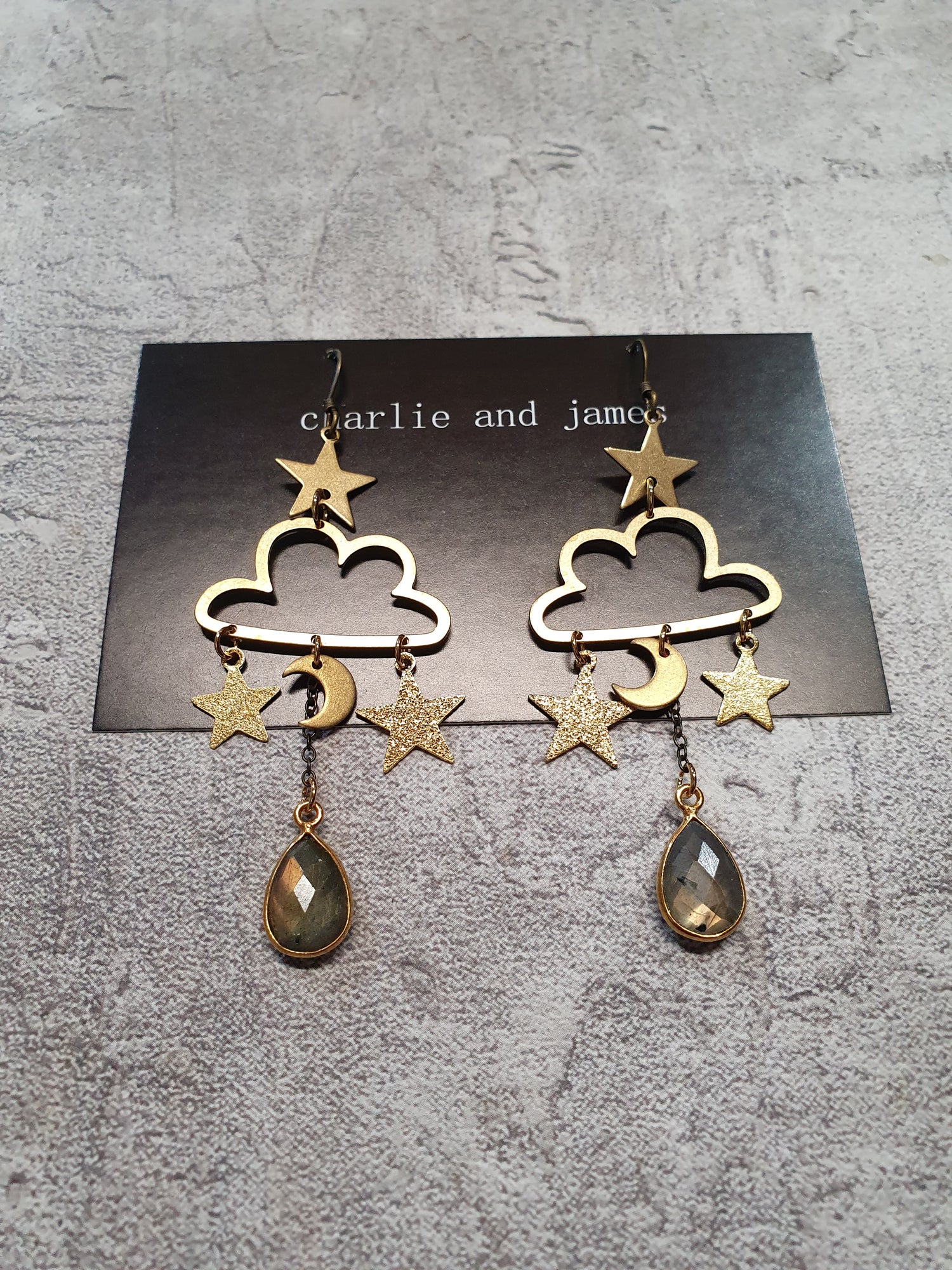 Brass monn and stars dangling from a brass cloud with a labradorite drop. Earwires are a low allergenic brass. No nickel, lead or cadmium.