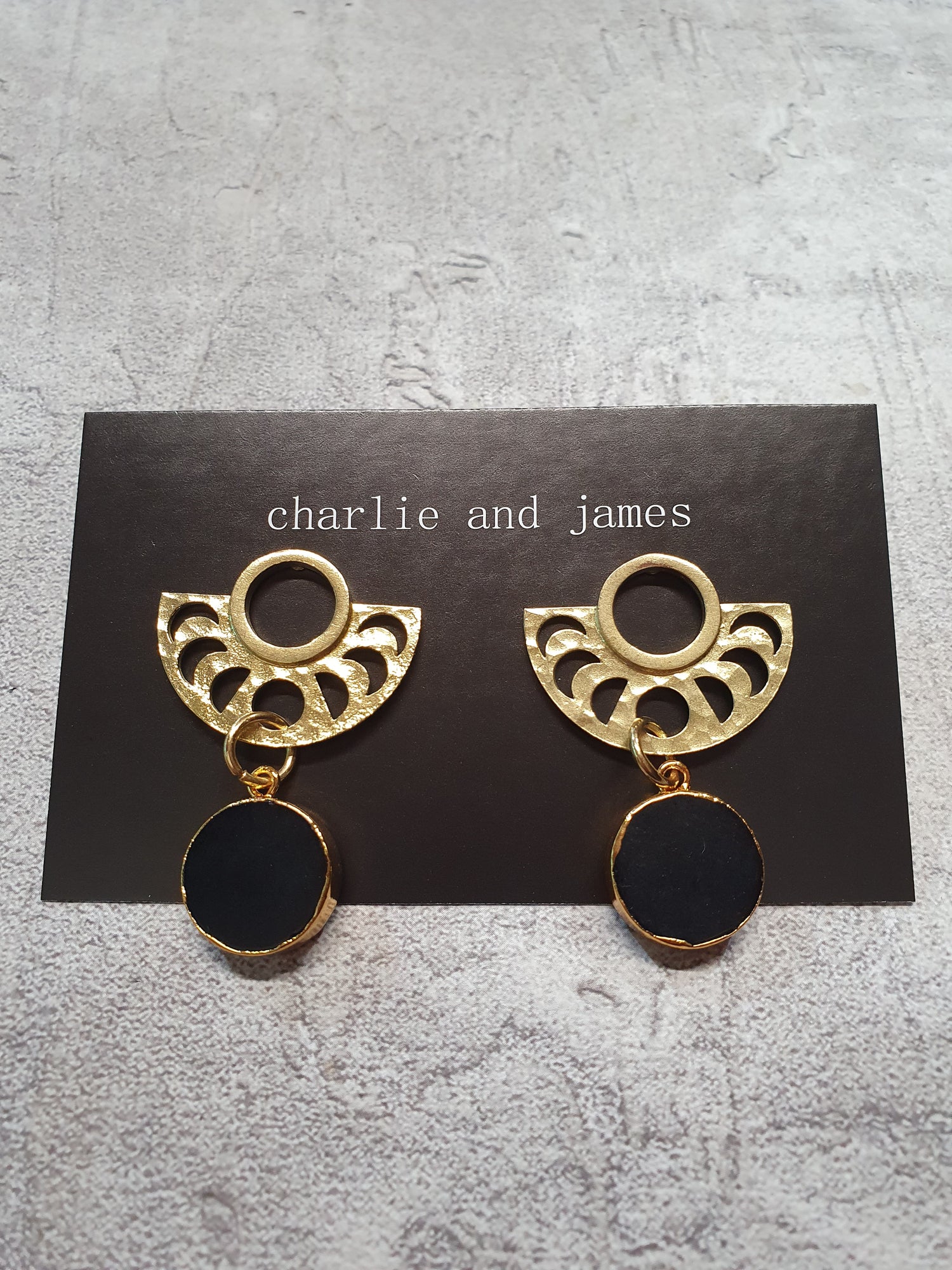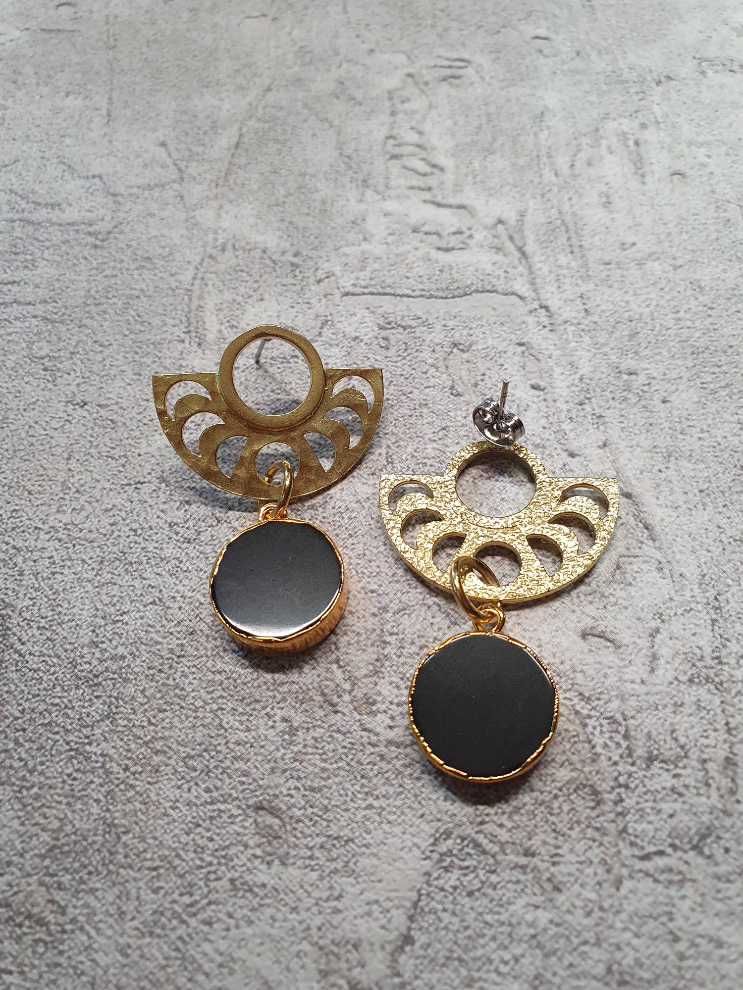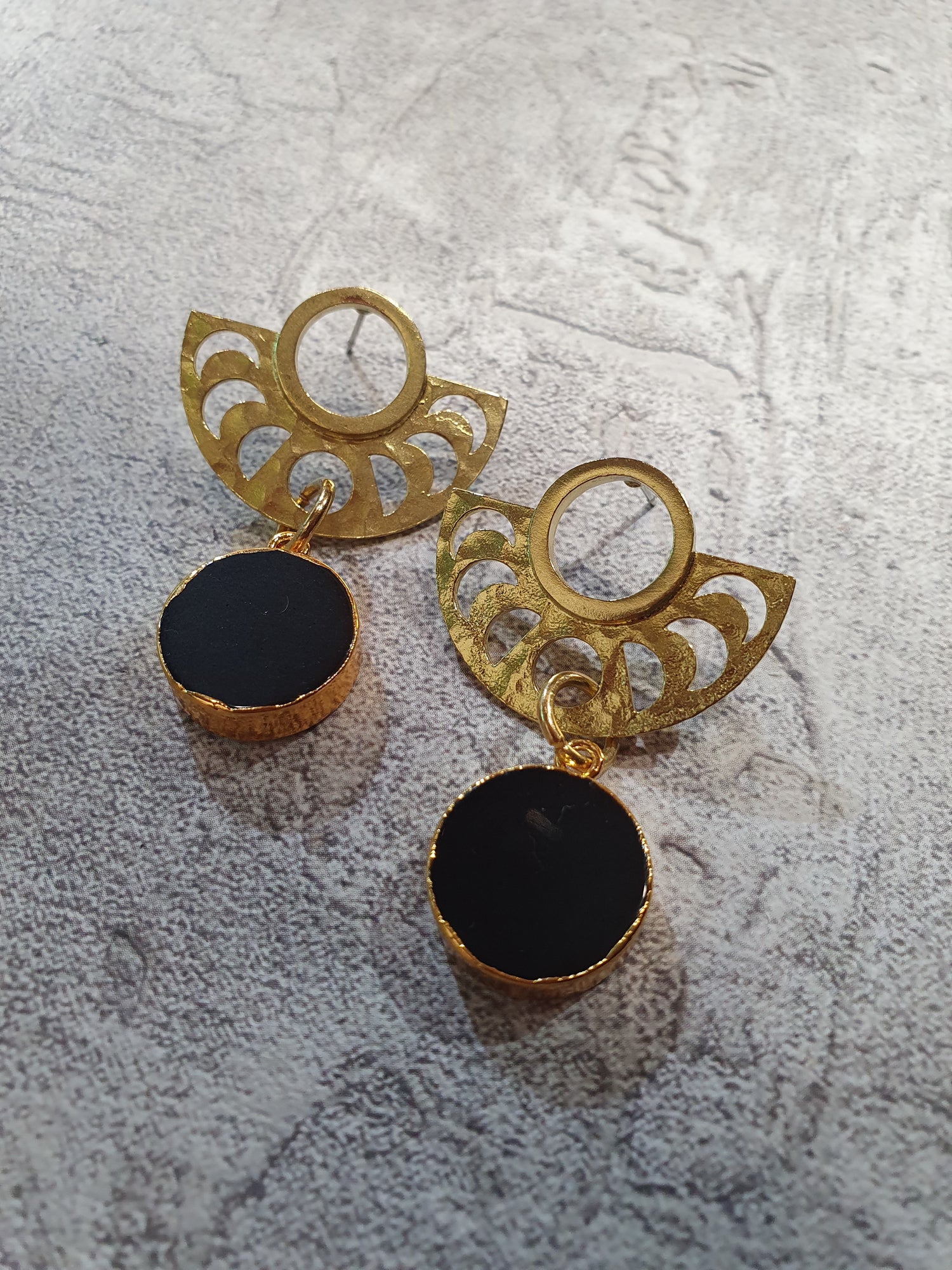 Brass moon phase studs with onyx drops. Surgical steel posts and backs.