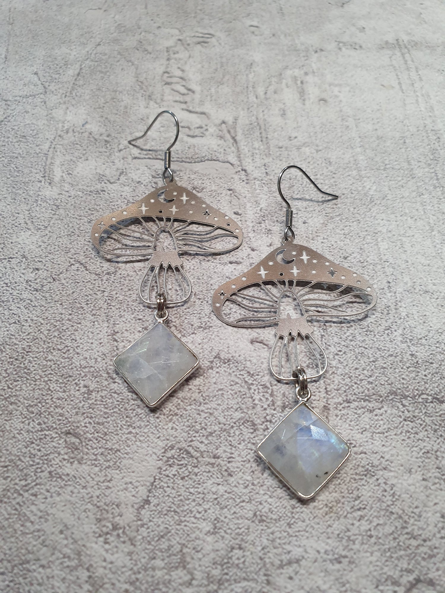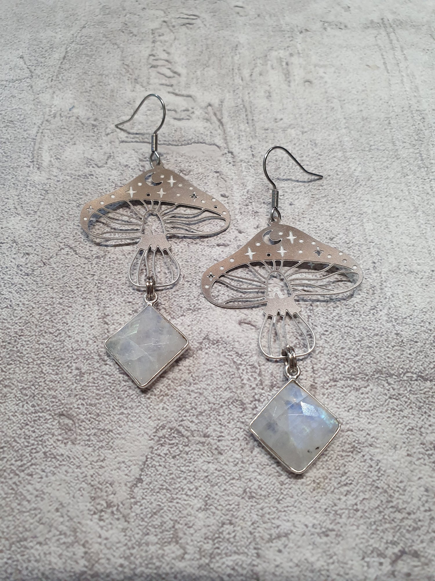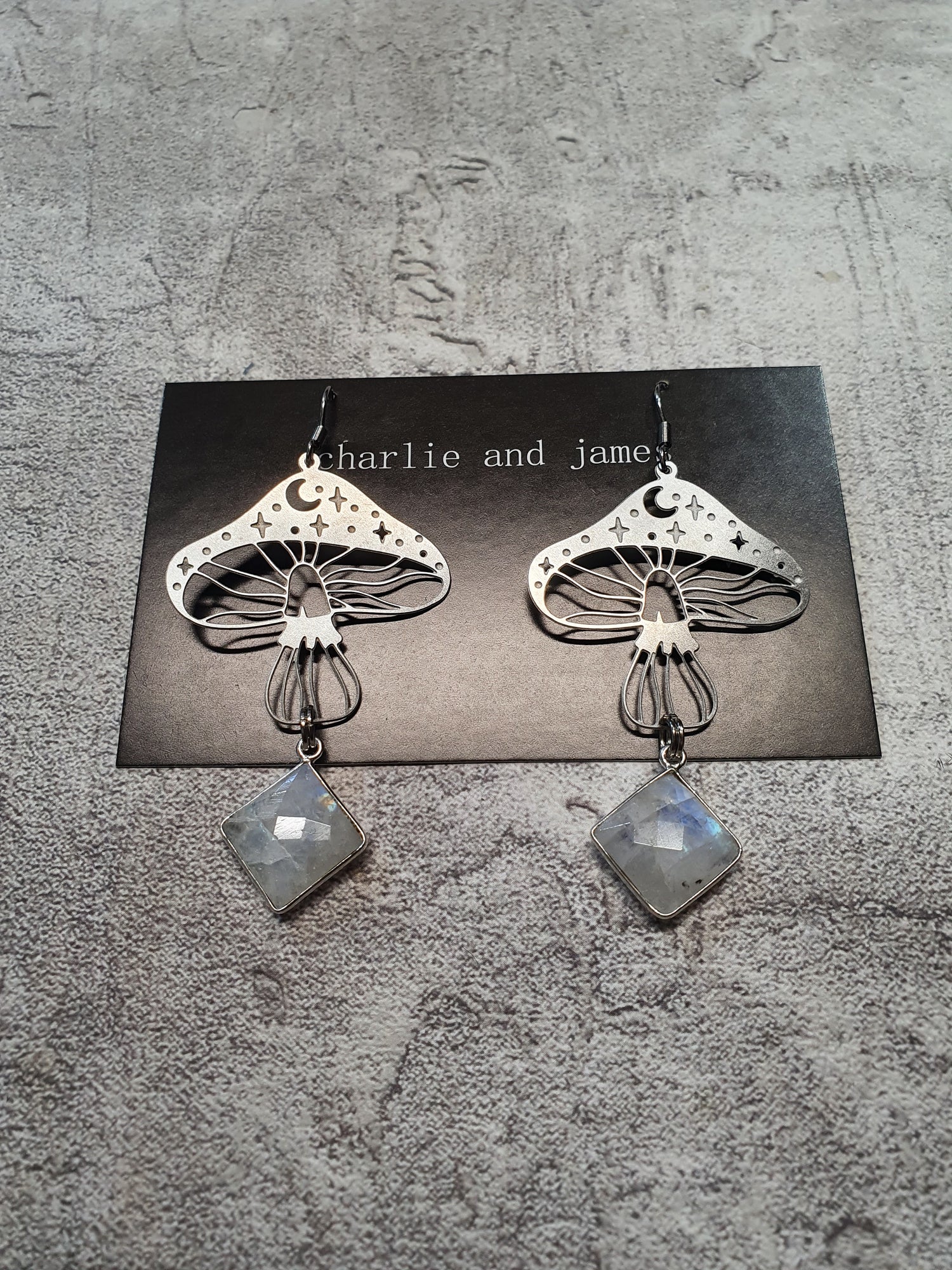 Stainless steel mushrooms with rainbow moonstone dangles. Surgical steel earwires.