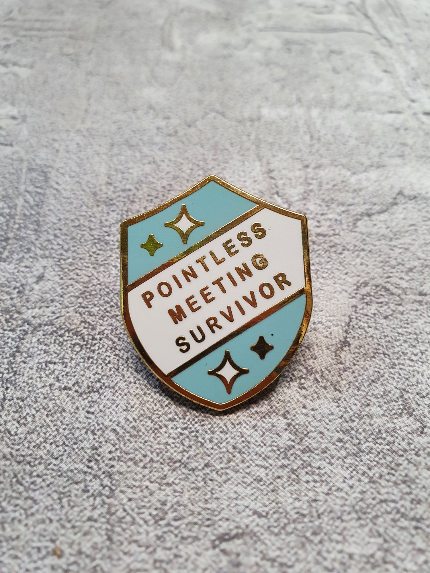 Enamel "Pointless meeting survivor" pin with rubber stopper.