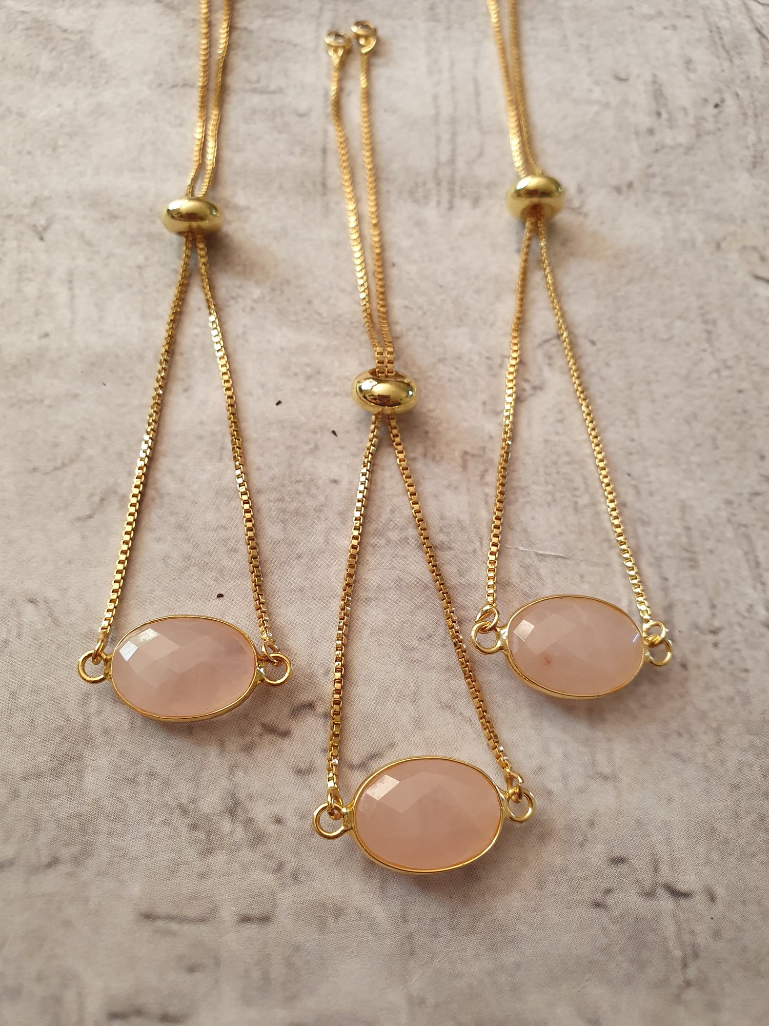 24k gold plated adjustable bracelet with rose quartz. The toggle slides up and down to easily adjust the size.