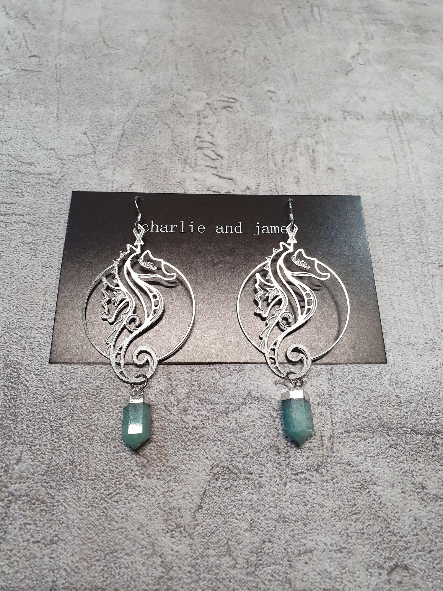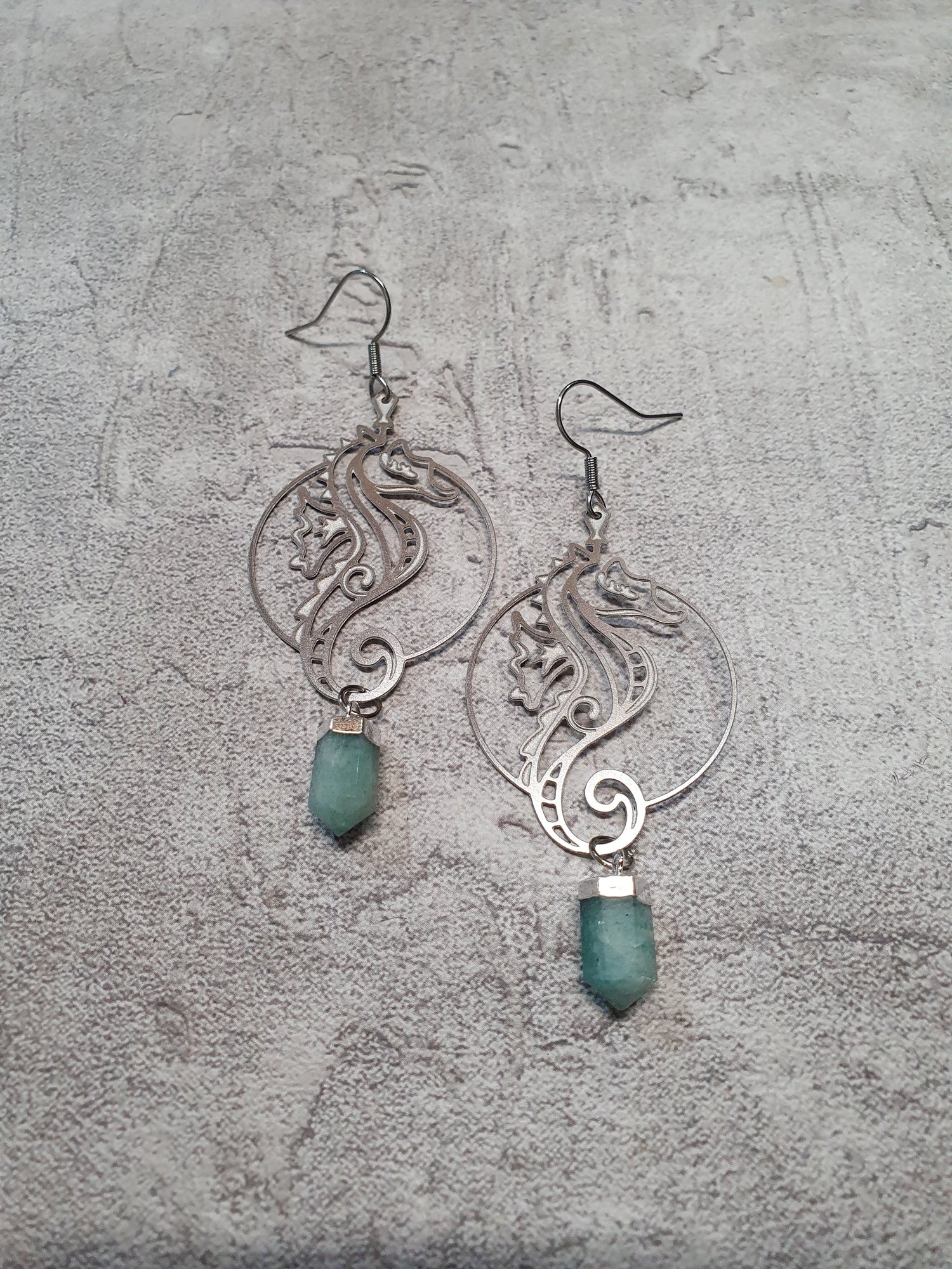 Lightweight stainless steel seahorse hoops with amazonite. Surgical steel earwires.