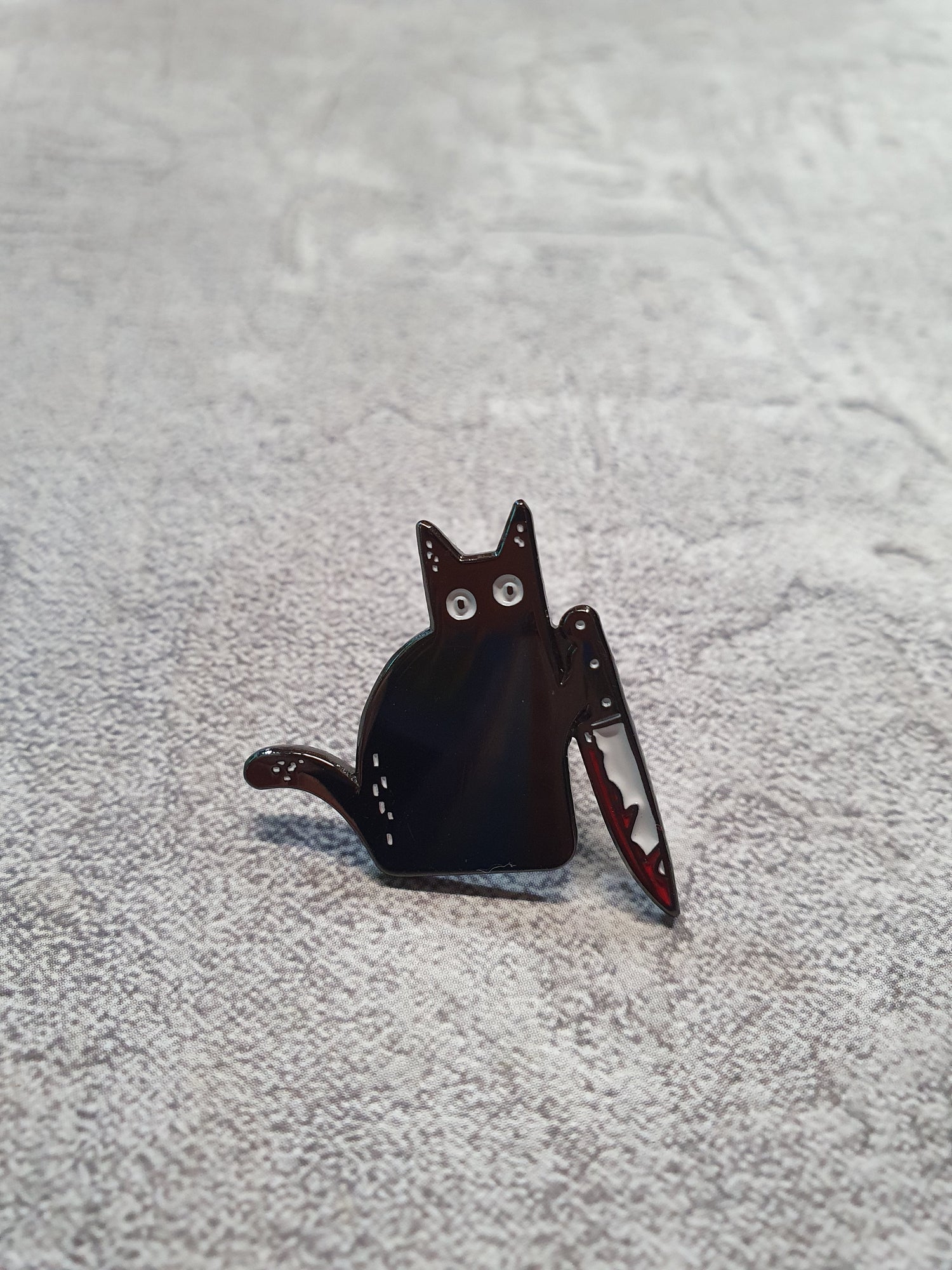 Black cat holding a bloodied knife. Enamel pin with rubber stopper.