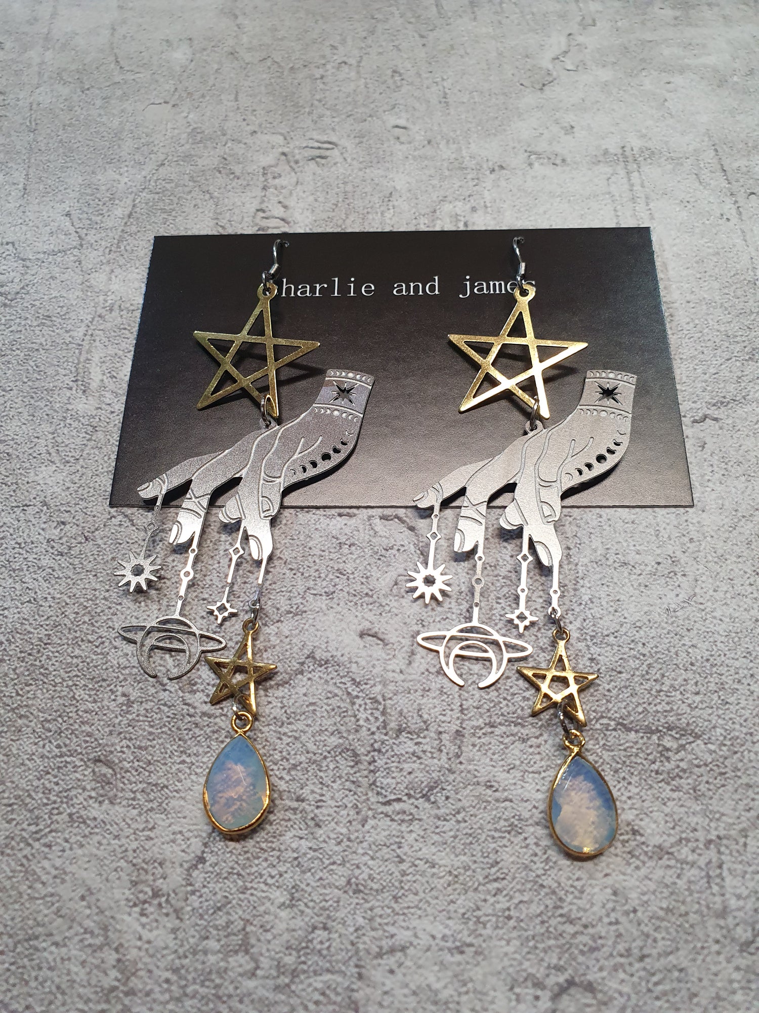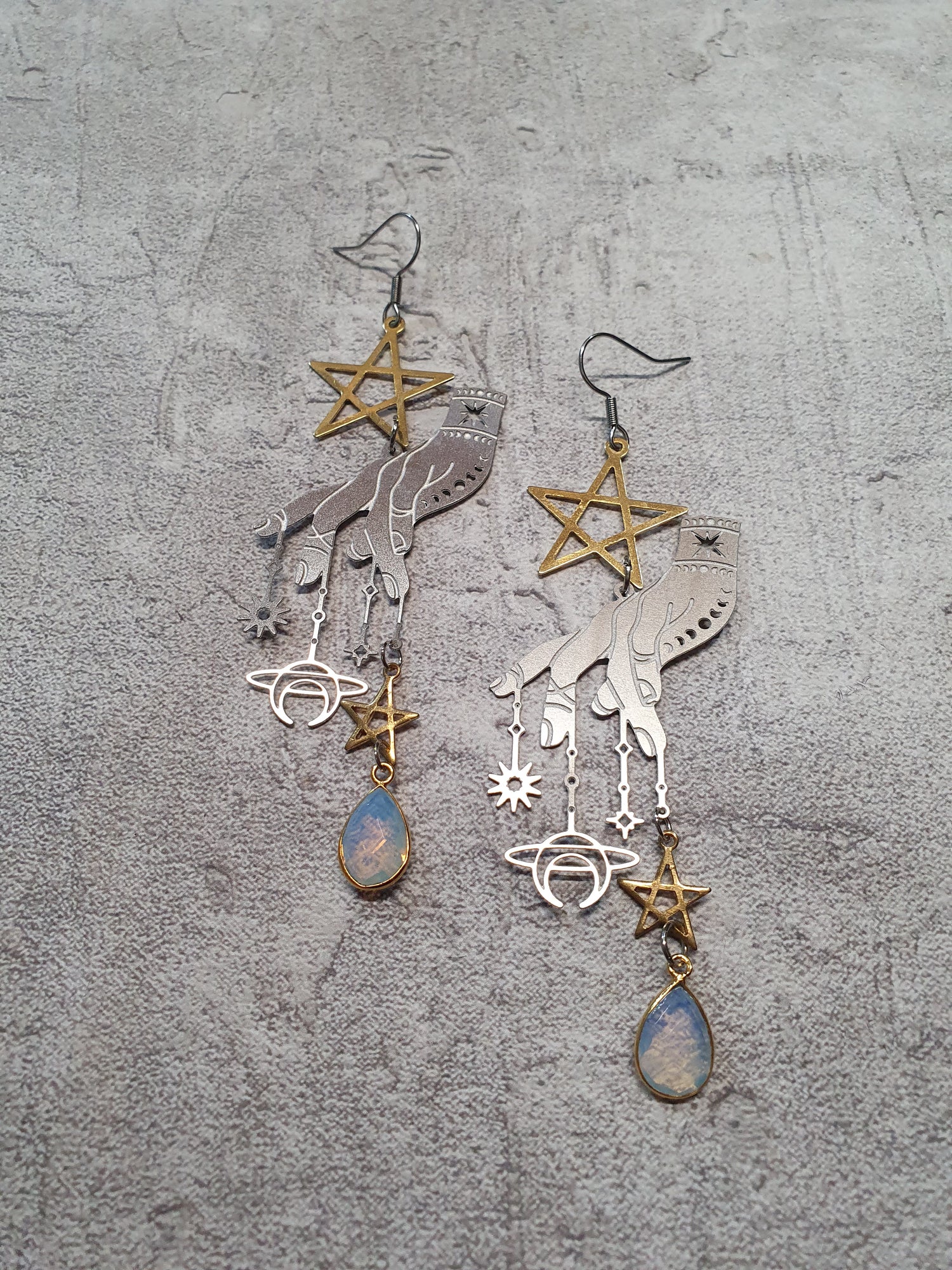 Stainless steel hands, brass stars and gold plated opalite. Surgical steel earwires.
